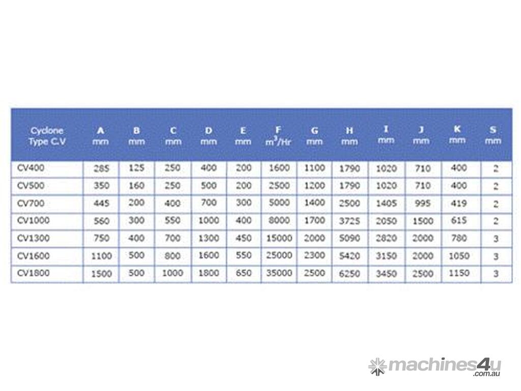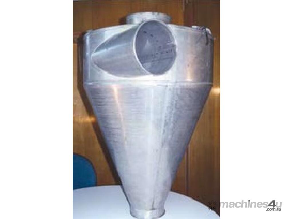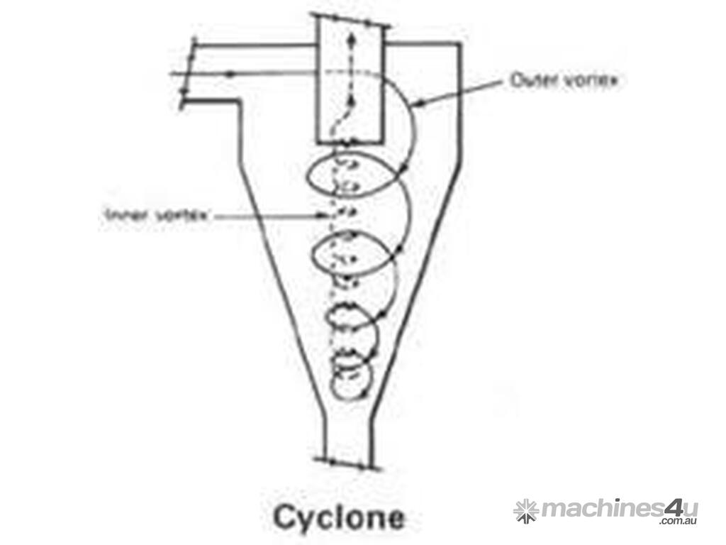 Polluted air first enters the cyclone through a rectangular inlet near the top. Centrifugal force is produced as the air enters and the dusty air spirals downwards. The heavier dust particles are forced onto the walls of the cyclone due to the centrifugal force and then fall into the bin below. The lightly and finer particles travel up through a cylindrical tube located in the centre of the cyclone and exit for further filtration by other equipment downstream (eg. Fabric dust collectors).