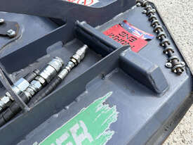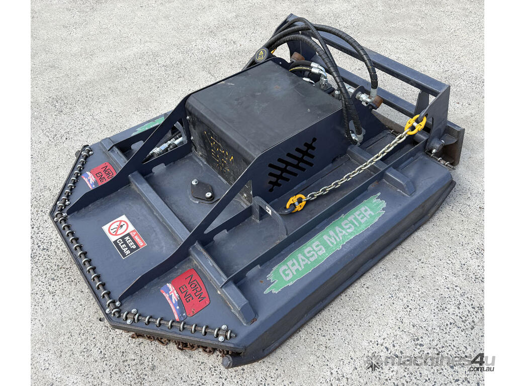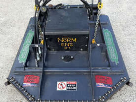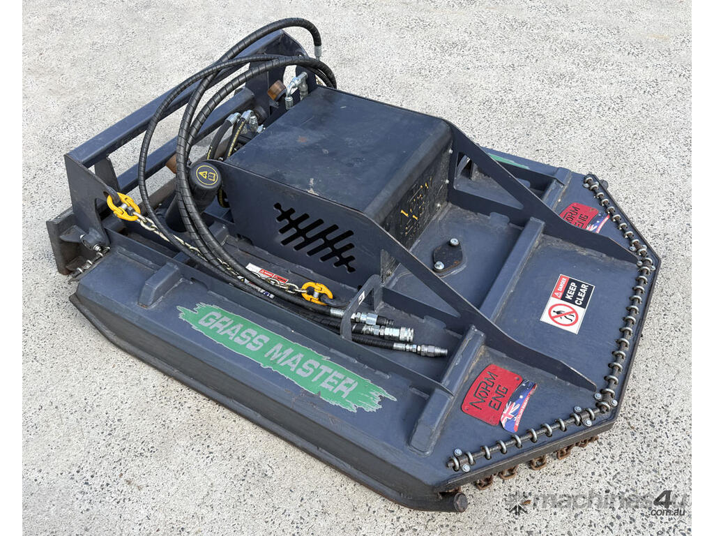 Norm 4ft slasher for ASV RT30 (or PT30, RT40) skid steer – 1220mm cut (1370mm overall width) – excellent condition (very little use) – heavy duty construction – three blade cutting desk (additional new blades and bolts x3 also supplied) – front and rear chain curtains for debris suppression – fitted with forklift points – floating frame – flat-face couplers – hydraulic flow 30-65 lpm – weight 300kg – designed and manufactured in Australia.