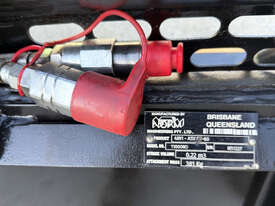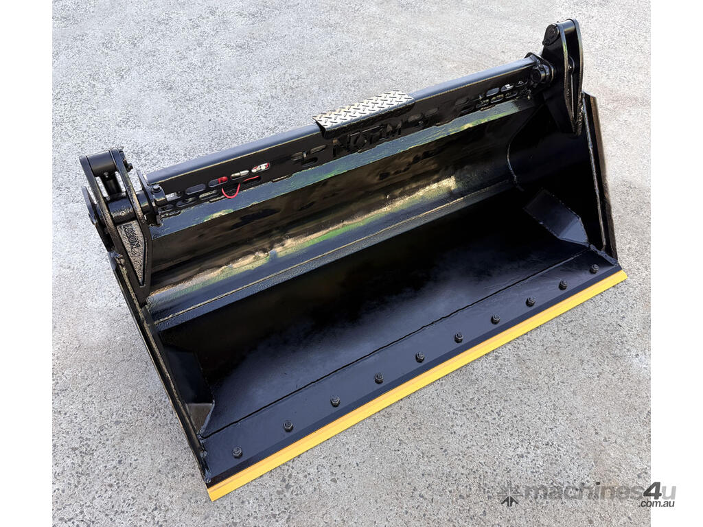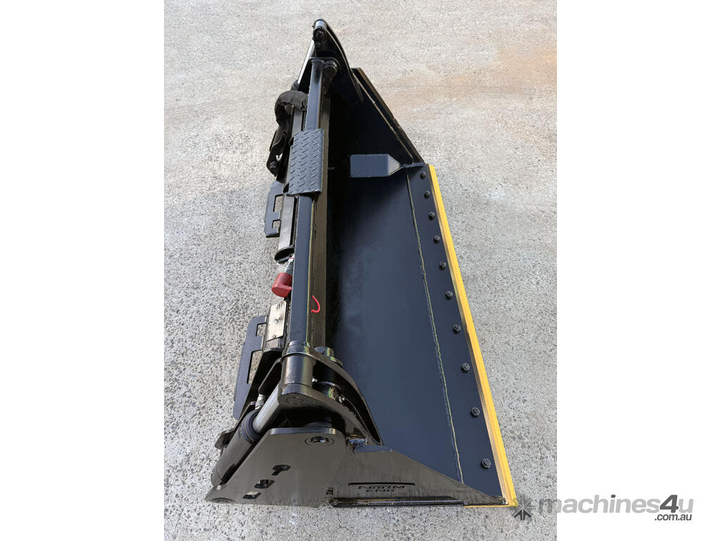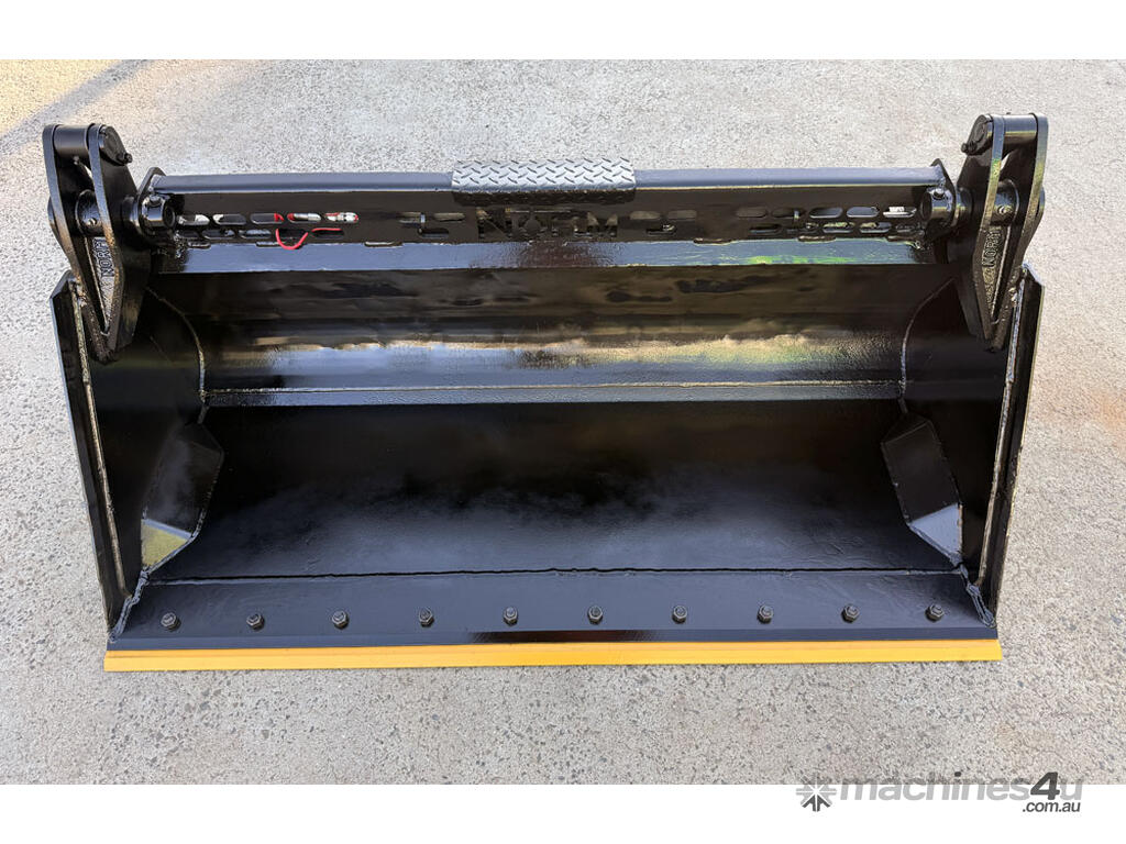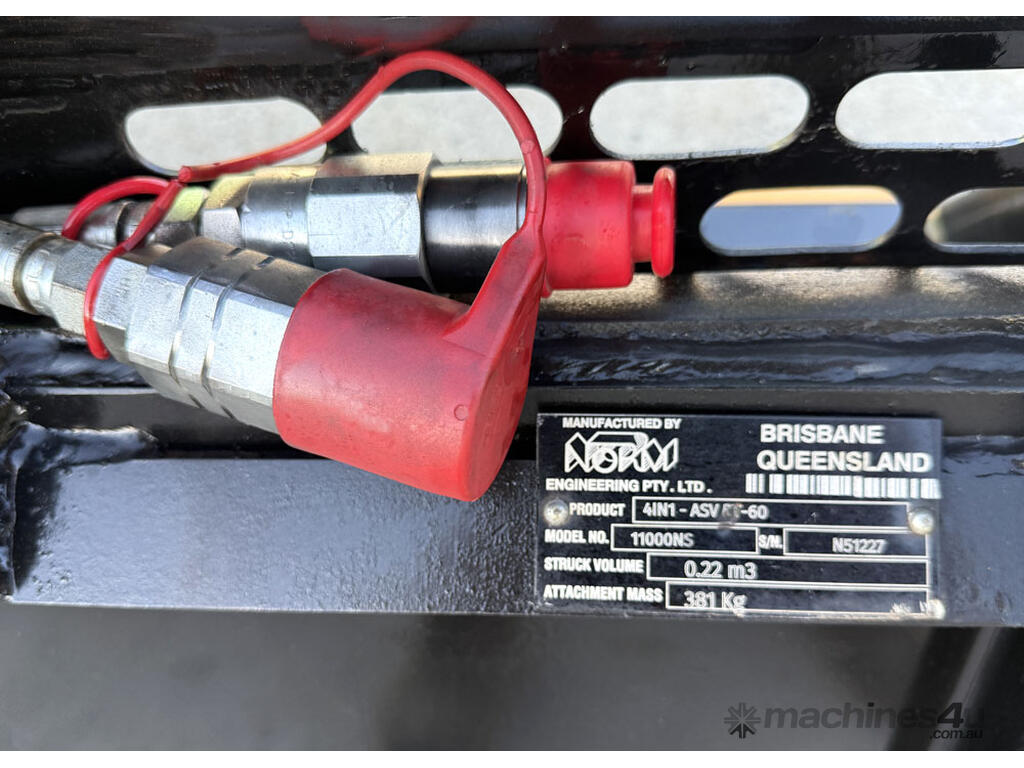 Norm Engineering 4in1 bucket for skid steers – 1585mm wide – very good used condition – heavy duty 20mm BisAlloy floor – new bolt-on reversible cutting edge – lock valve – flat-face couplers – 0.22m3 capacity – weight 381kg.