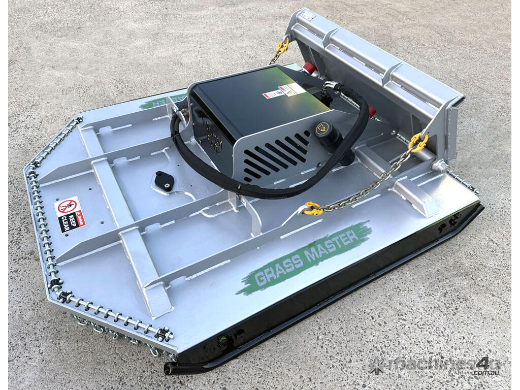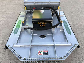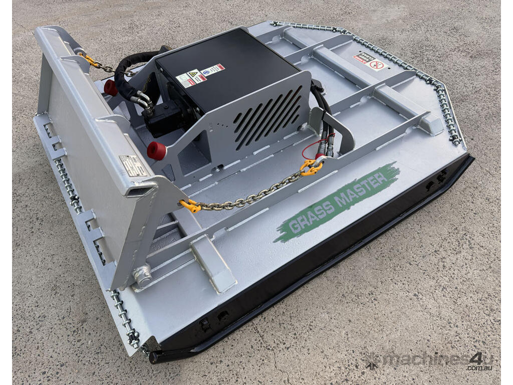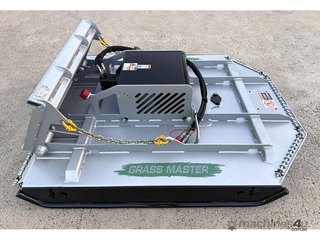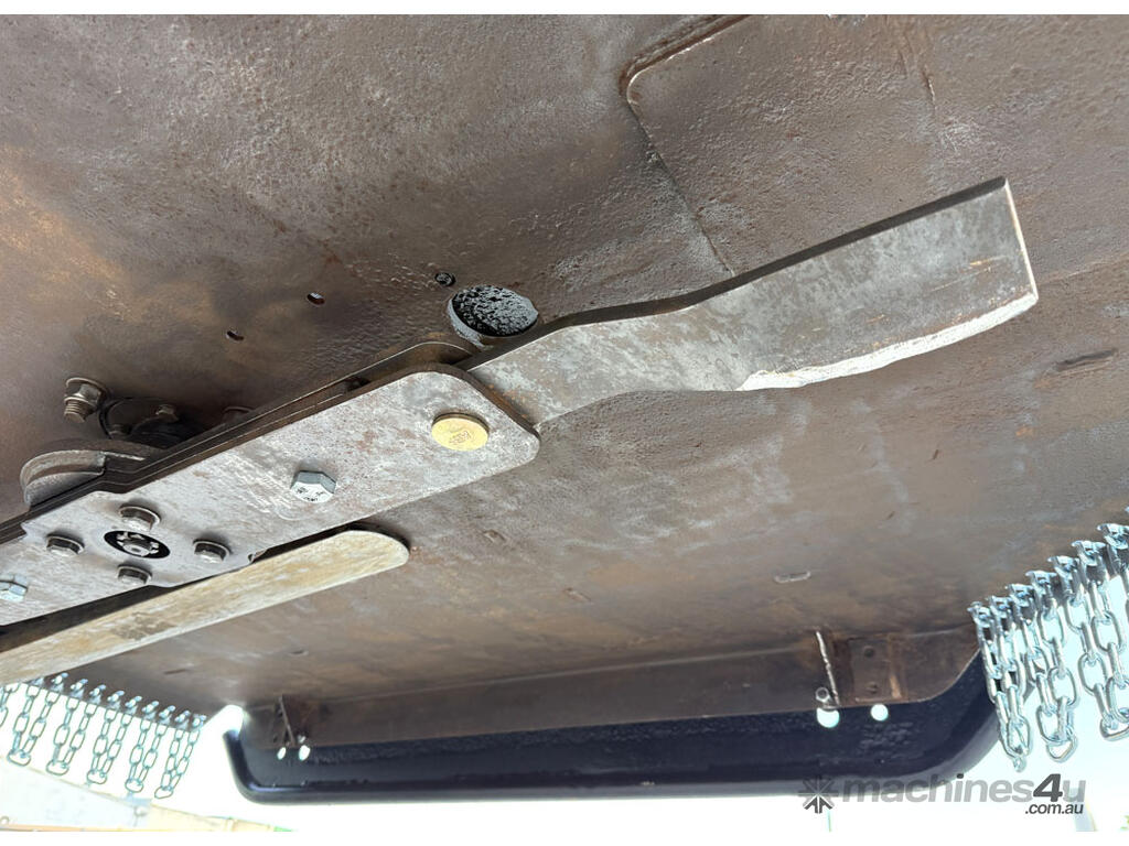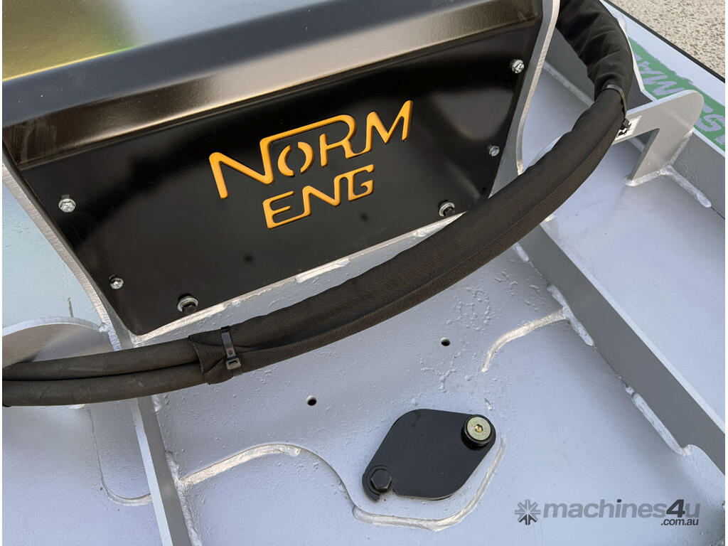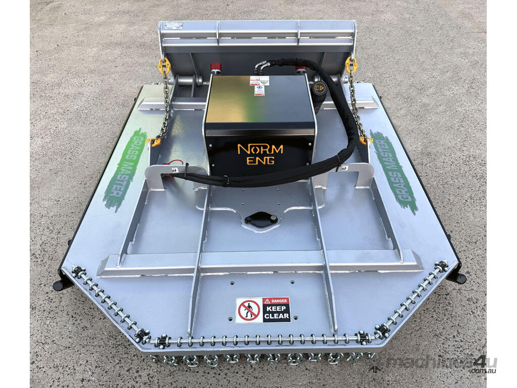 Norm 5ft slasher for skid steers – 1500mm cut (1650mm overall width) – excellent condition (renovated) – heavy duty construction – single cutting bar (blades sharpened and new blade bolts fitted) – new front and rear chain curtains for debris suppression – adjustable and replaceable side skid rails – fitted with forklift points on the slasher deck – floating frame – flat-face couplers – designed for low hydraulic flow (40-60 lpm) – weight approx 490kg – designed and manufactured in Australia.