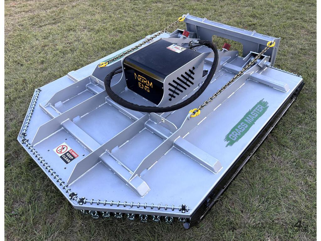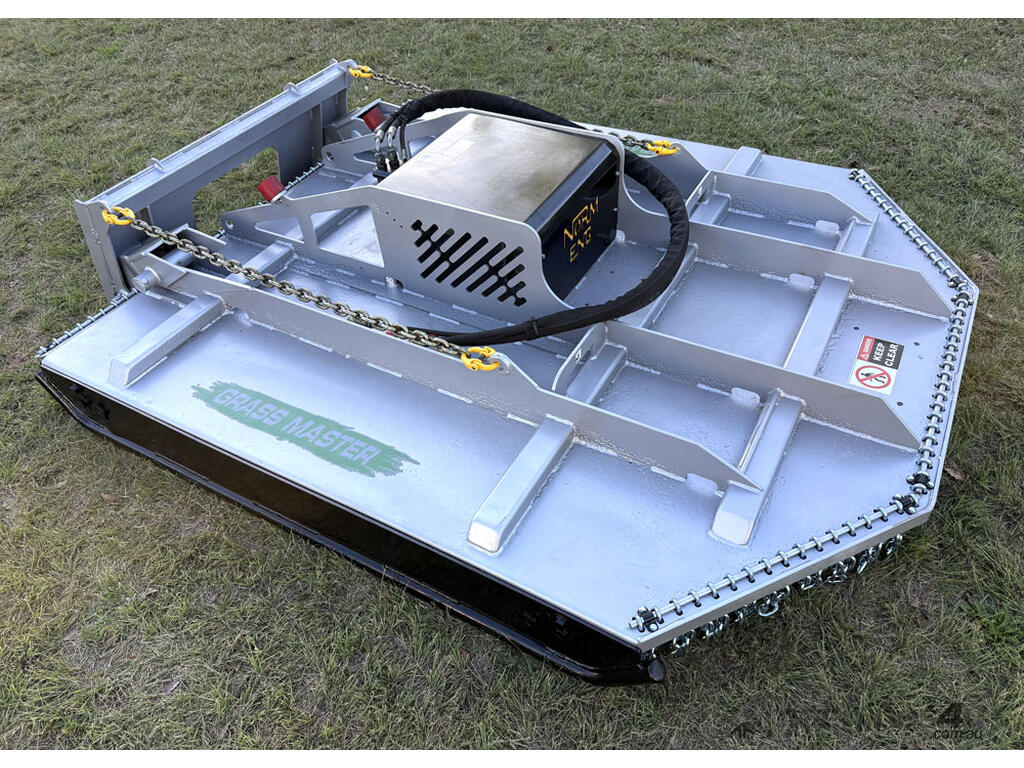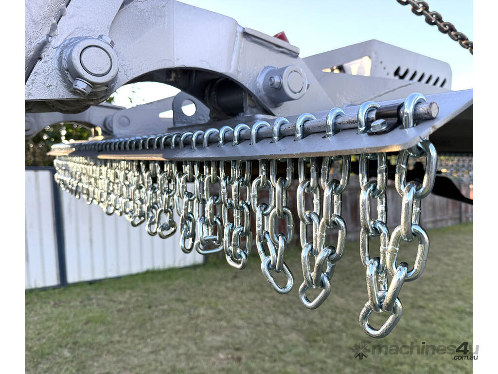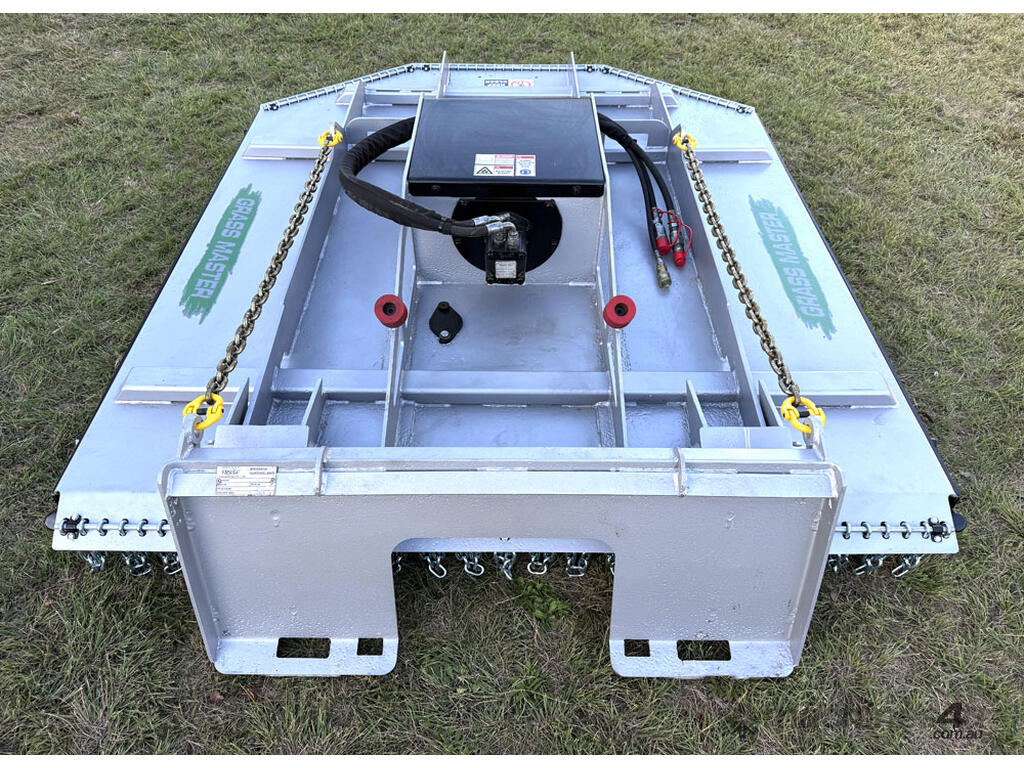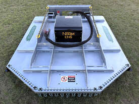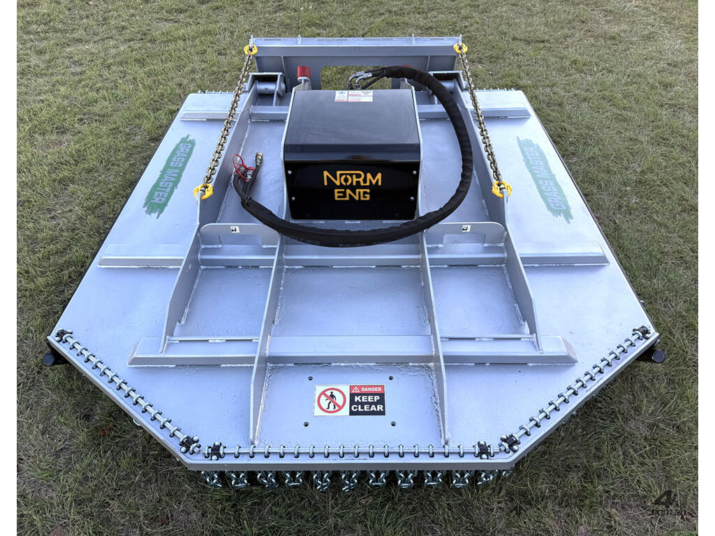 Norm 6ft slasher for skid steers – 1800mm cut – very good condition (renovated) – heavy duty construction – single cutting bar (blades sharpened) – new front and rear chain curtains for debris suppression – adjustable and replaceable side skid rails – fitted with forklift points on the slasher deck – double-pivot floating frame (designed for air conditioned skid steers with side opening doors) – flat-face couplers – designed for medium hydraulic flow (40-60 lpm) – weight approx 650kg – designed and manufactured in Australia.