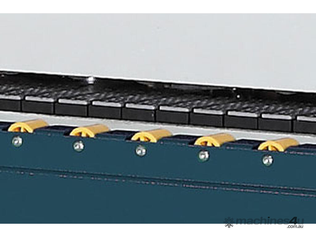 The steady work-piece feeding mechanism is comprised of a chain and set of drive rollers, which will leave no scratches on the work-piece surface.