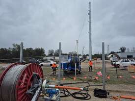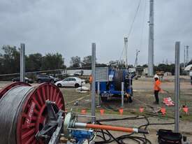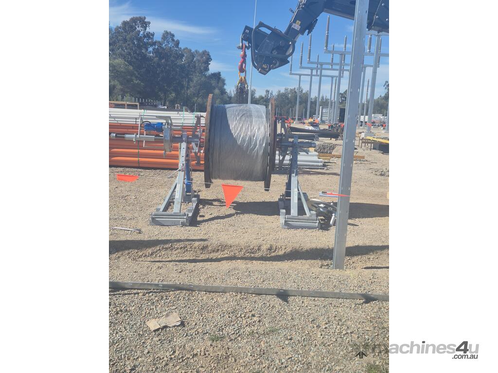 The OMAC F155 reel-stands are rugged, site-ready stands designed for lifting and braking reels while stringing conductors and cables. Supplied in pairs, the F155 range covers reel diameters from 1.00 m up to 4.00 m and pair capacities from 7,000 daN to 20,000 daN (70 ? 200 kN). Stands are height-adjustable independently, fitted with a self-braking disk brake and mechanical safe-stops. Optional hydraulic drive, rope winders and enhanced braking are available for controlled recovery and release operations on site.