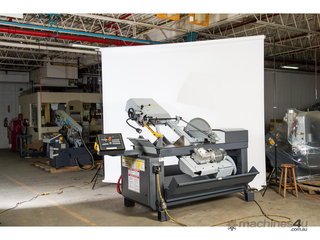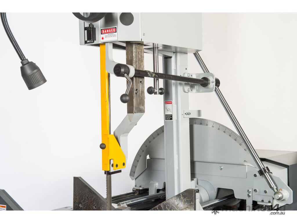 With a capacity of 527 x 457mm and made in Canada, this semi-automatic vertical band saw is one of a kind with its saw head that can cut at 90° and be adjusted to cut at a 3° canted head plus program to mitre 60 degrees left and right.