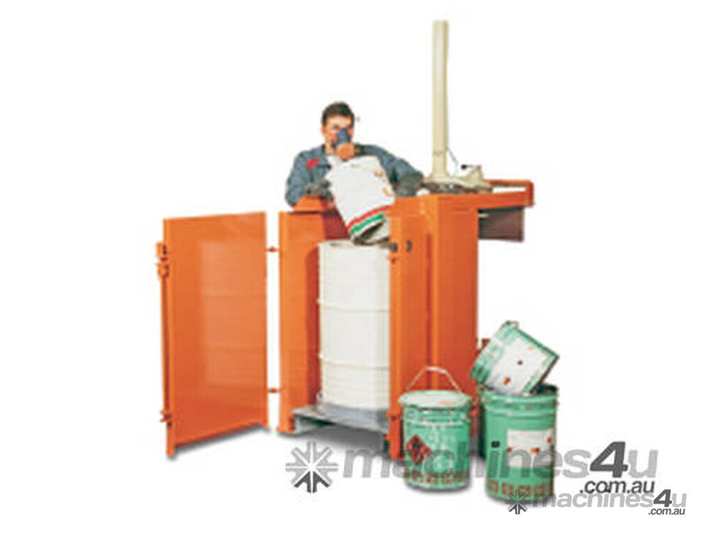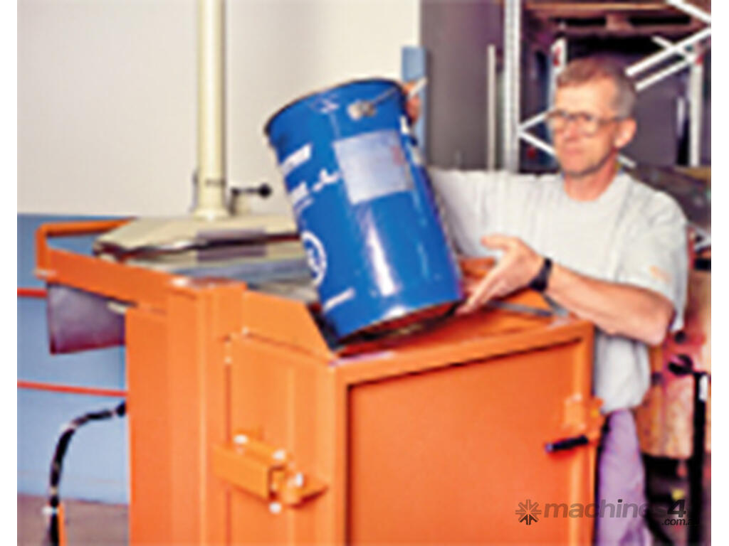 The 5030-N HD model has a special application for safe compaction of hazardous waste (glass/cans/tins containing residual paint or chemicals) into drums. A steel pallet is included for stable placement of the drum inside the compactor.