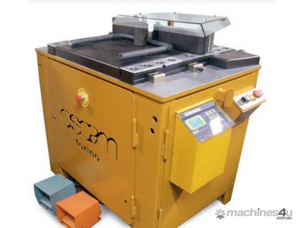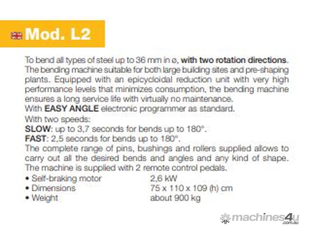 The complete range of pins, bushes and rollers supplied allows to carry out of all the desired bends and angles and any kind of shape. The machine is supplied with 2 remote control pedals.