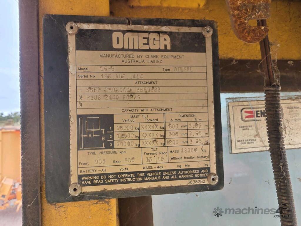No C/P,Omega,16-6,Forklift,Diesel,Odometer not visible,7647 (Hrs. Showing on Hour meter),Unregistered,Serial No: 196.AUF.L414,Sold with No Plates