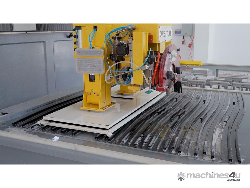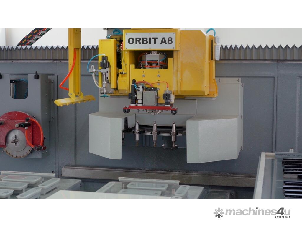 The Orbit A8 is a double table 5-axis SawJet with vacuum manipulator, it’s also a full-fledged 5-axis CNC work center and an undermount and edge polisher all in one!