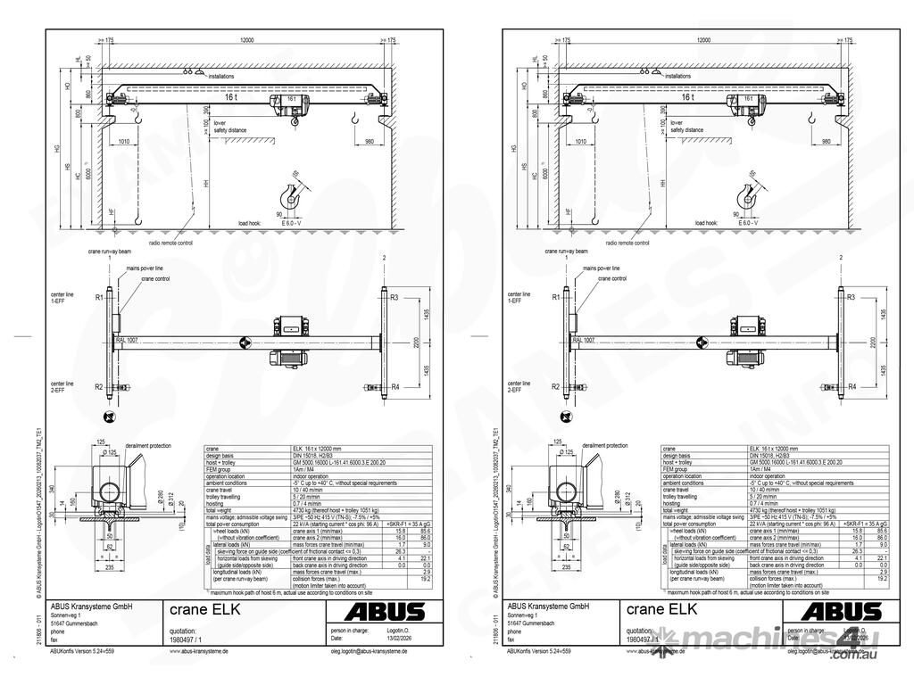 In this ad we provide general specifications for a 16t x 12m single girder overhead travelling crane equipped with the GM3000 model hoist. For more information please contact Ron.
