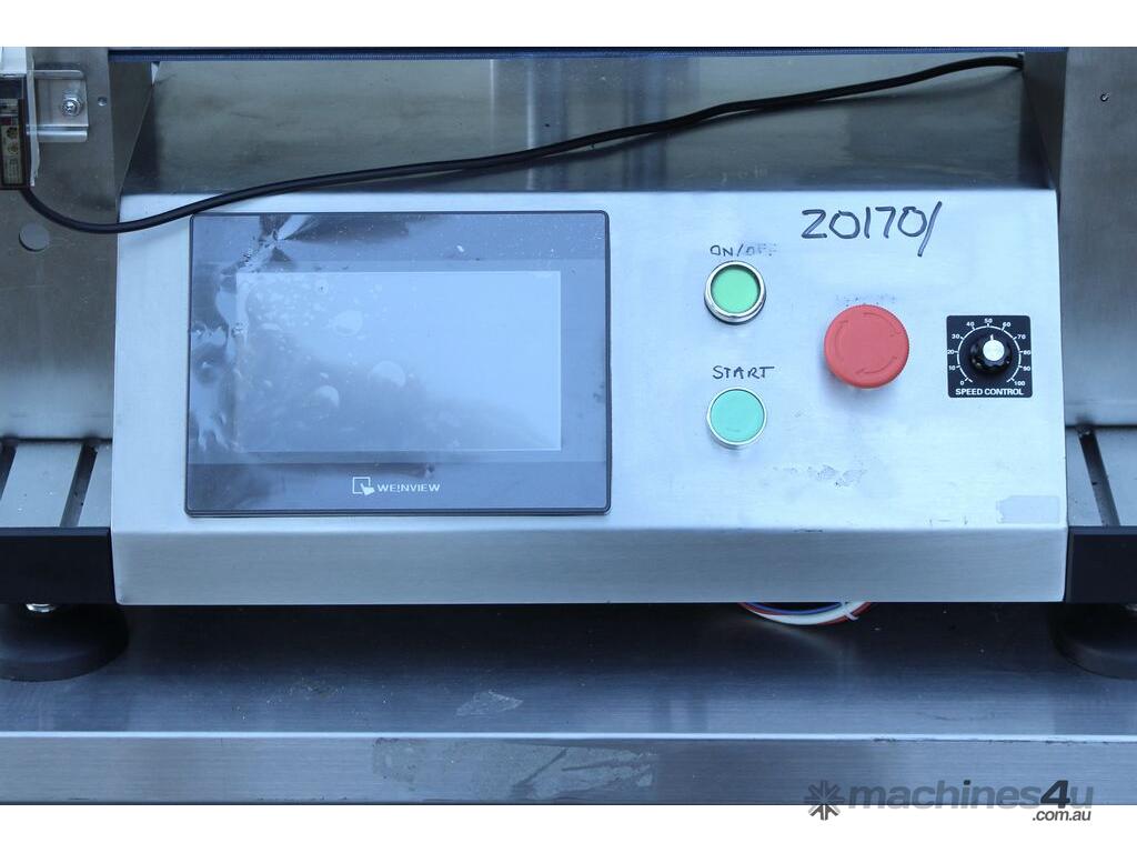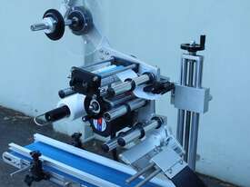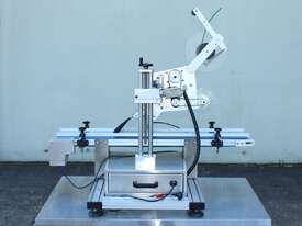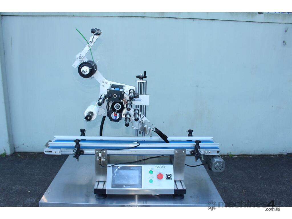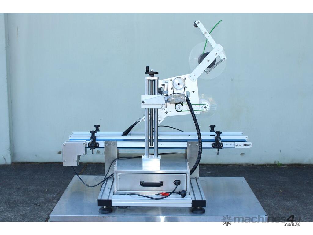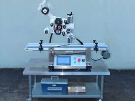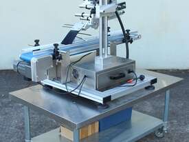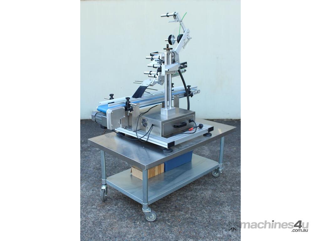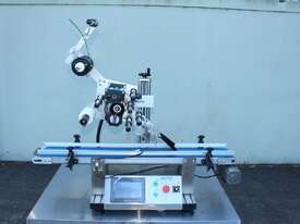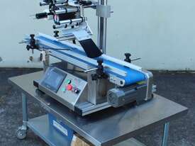 Overhead Labeller with a motorised conveyor, Benchtop style on a stainless steel Trolley