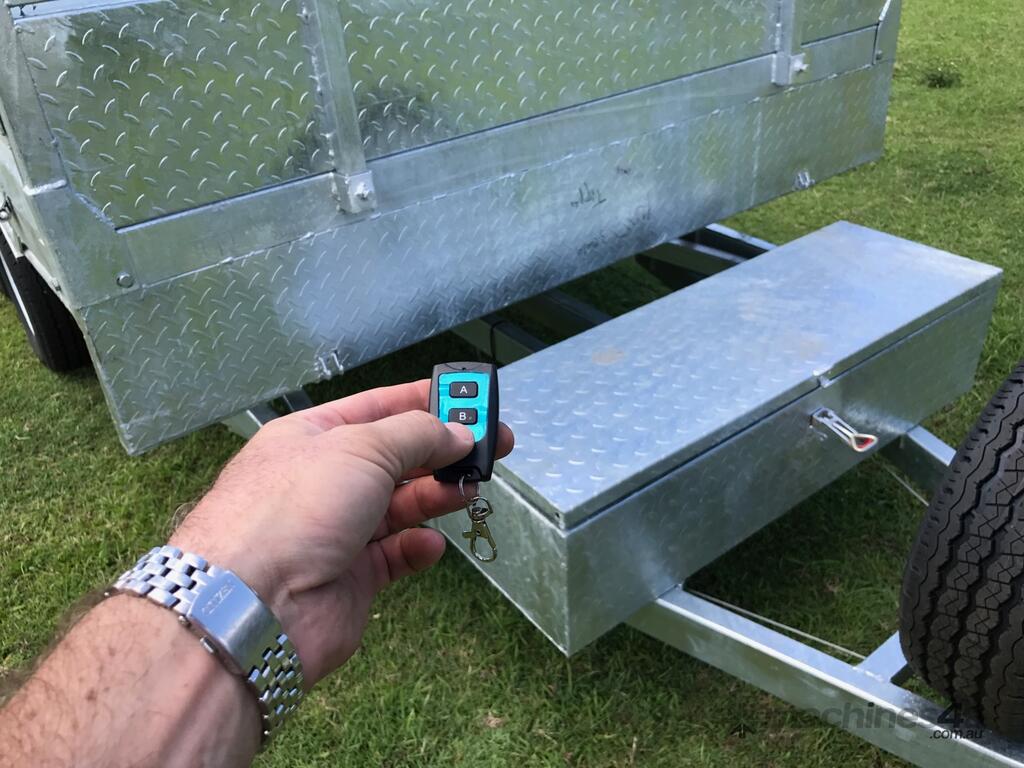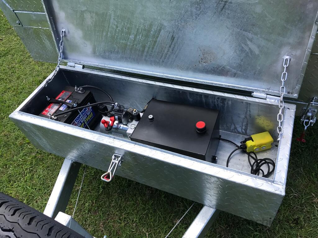 Complete with corded and wireless remotes the hydraulic pump and deep cycle battery are housed in a lockable steel toolbox mounted on the drawbar.
