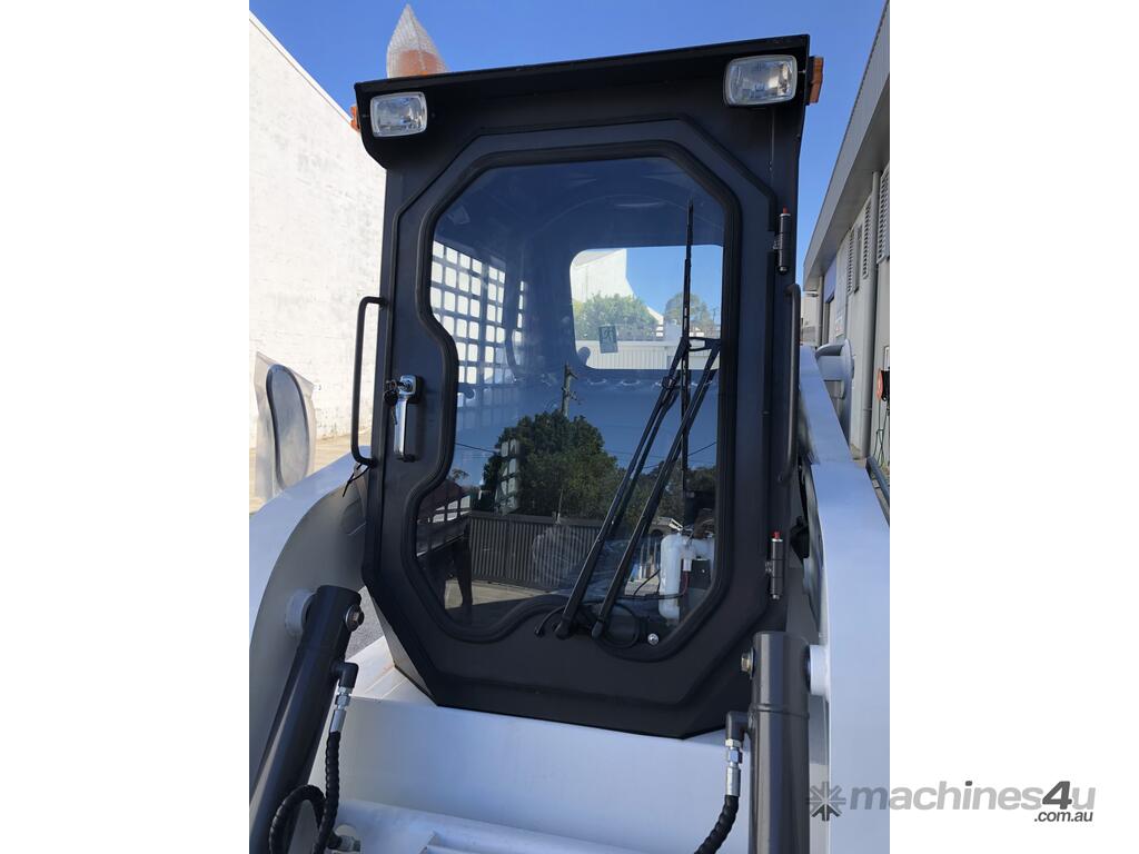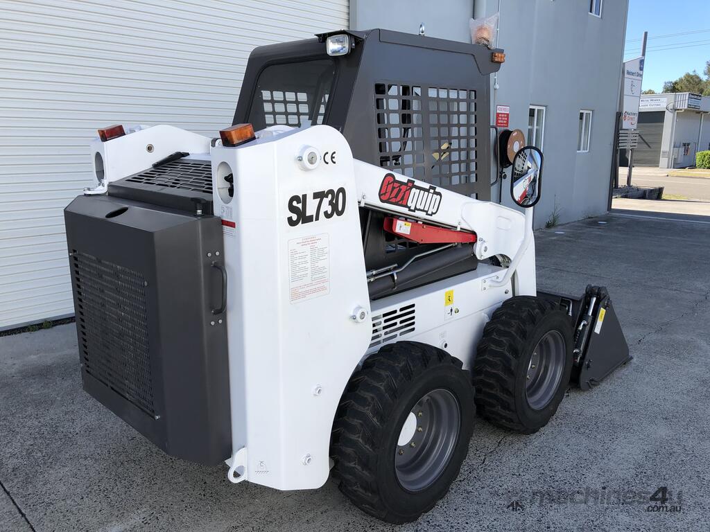 Ozziquip SL730 Skid Steer Loader With Air Conditioned Cab, Forks, Digga 1500mm Slasher, Digga Chain Trencher