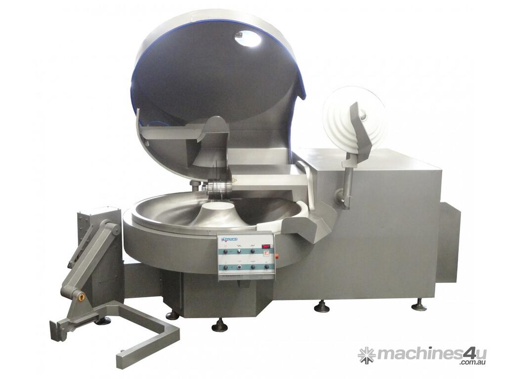 The Pacific 330L Vacuum Bowl Cutter is a high quality bowl cutter suitable for a wide range of applications in the small goods, butchery, nuts (such as peanuts, cashews etc) and fruit and vegetable industries, fitted with a powerful 106kw motor and capable of processing up to 260kg of meat per batch, it is also fitted with an integrated unloader ensuring ease of operation. This machine has 4 knife speeds and 2 bowl speeds and is fitted with German steel blades. It is very well designed and built, featuring over sized bearings on the main shafts that are precision machined to ensure smooth operation and a fully cast stainless steel bowl which also features an anti-overflow pan edge design.