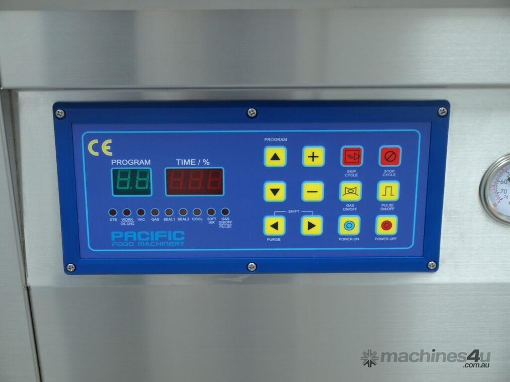 The Pacific 800 Single Chamber vacuum packer is suited for any medium sized butcher, small goods manufacturer, food processor or manufacturer who wishes to seal large quantities of product whilst maintaining single-operator efficiency during production and a design that stands up the rigors of use in an industrial environment. Featuring dual lid mounted seal bars along the left and right hand side measuring 660mm long with a 6mm wide seals for reliable & secure seals every time, easily removable aluminium cushion bars which make cleaning the top deck simple and quick, utilising 100% stainless steel frame & body construction, a high quality Busch 120m3/h vacuum pump with overload warning & oil change indicator, waterproof & programmable digital control panel, IP56 rated electrical cabinet, locking castors for ease of movement & high density plastic filler plates, this single chamber vacuum packing machine will provide years of reliable and quality service.