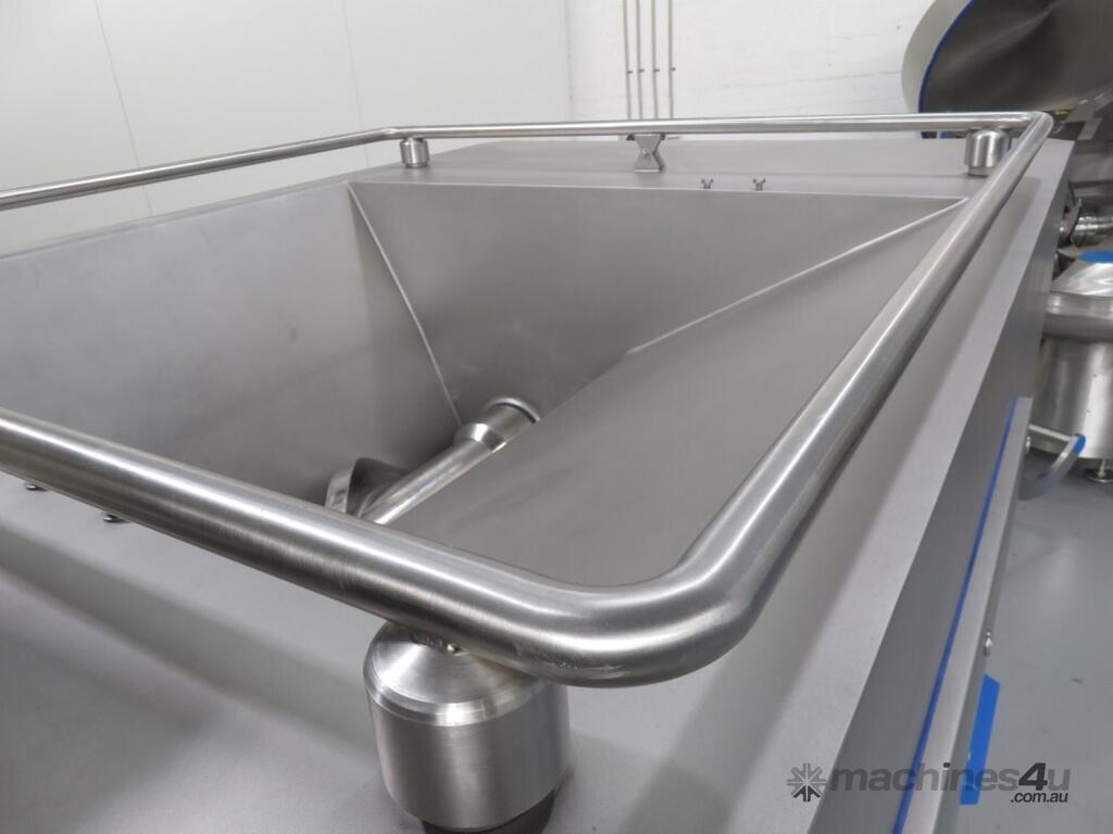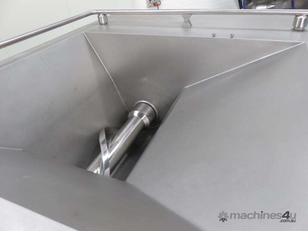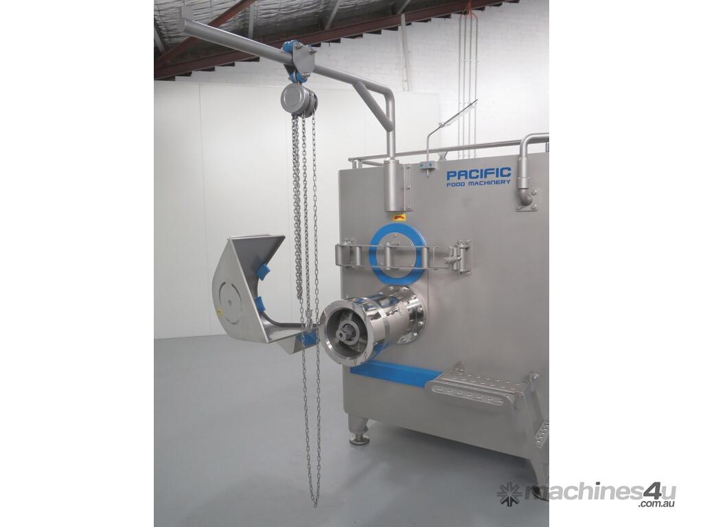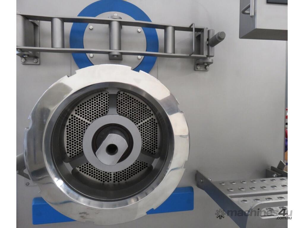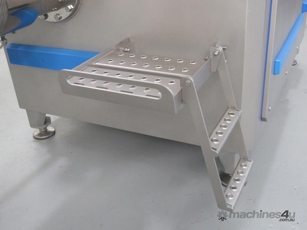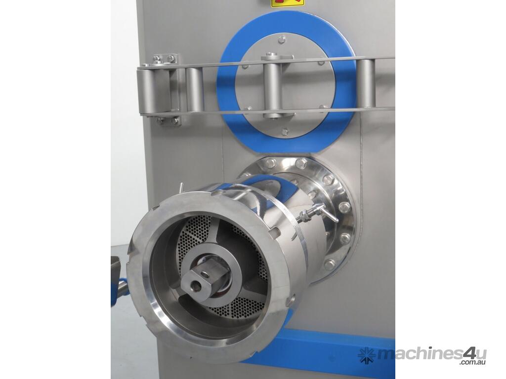 Worm ScrewVariable speed worm screw. Cuts blocks rather than breaking them up resulting in less fines and dust.Fresh, Tempered or FrozenCapable of effortlessly grinding both fresh meat and frozen blocks down to -18c in temperature.Knife Set ConfigurationsSingle or double knife set configurations possible. Crane DavitIntegrated crane davit for heavy duty lifting of machine tools.Hinged HatchProviding easy access for cleaning and maintenance.Trip BarHopper trip bar with rocker switch provides safety on the input of the machine. Inspection StepStep and mirror provide for easy inspection during maintenance and production.Accessory TrolleyTrolley for the easy storage and transportion of tools. Aids in handling while dismantling and for the cleaning of the parts.Optional: Incline ConveyorWe provide both bin lifters and incline conveyors to aid in the loading of blocks and products in to the hopper. Dual auger grinderFresh soft meats and fats, as well as tempered or hard frozen blocks are e?ectively processed together or separatelyVariable speed worm screwSingle or double knife setPulley chain hoist (crane davit) for ease of liftingHatch at front for accessiblity and cleaningSwing away arm with digital computer controlsPerfect fne and coarse grind, both fresh meat and frozen meat blocks15kW 27.4A motor on feeding screwPowerful 90kW, 150A large motor on grinding screwRobust designInspection step and mirrorAccessory trolleyOptional: Bone/sinew removal sytemOptional: Incline loading conveyorOptional: 200L/300L bin lifter