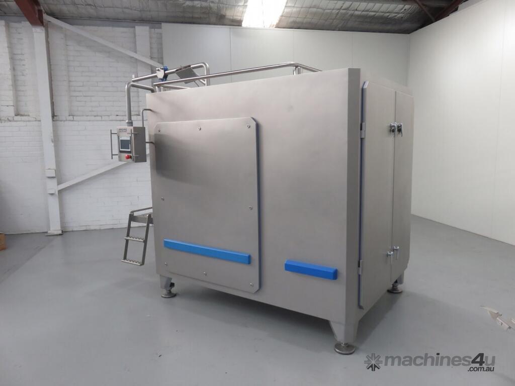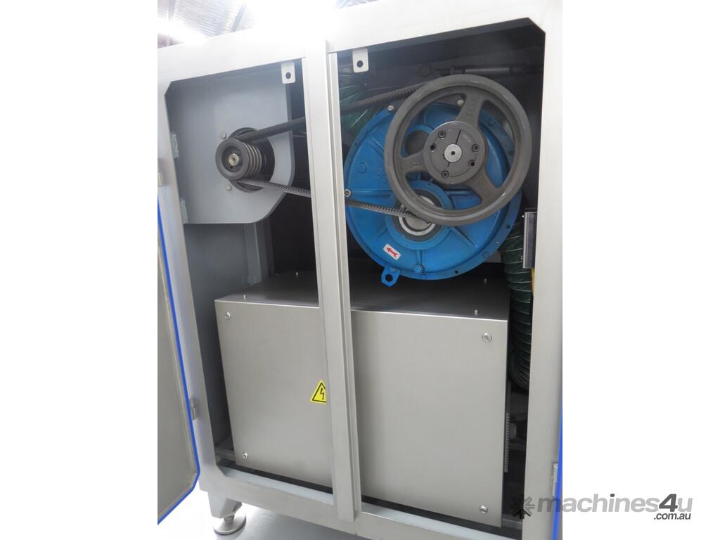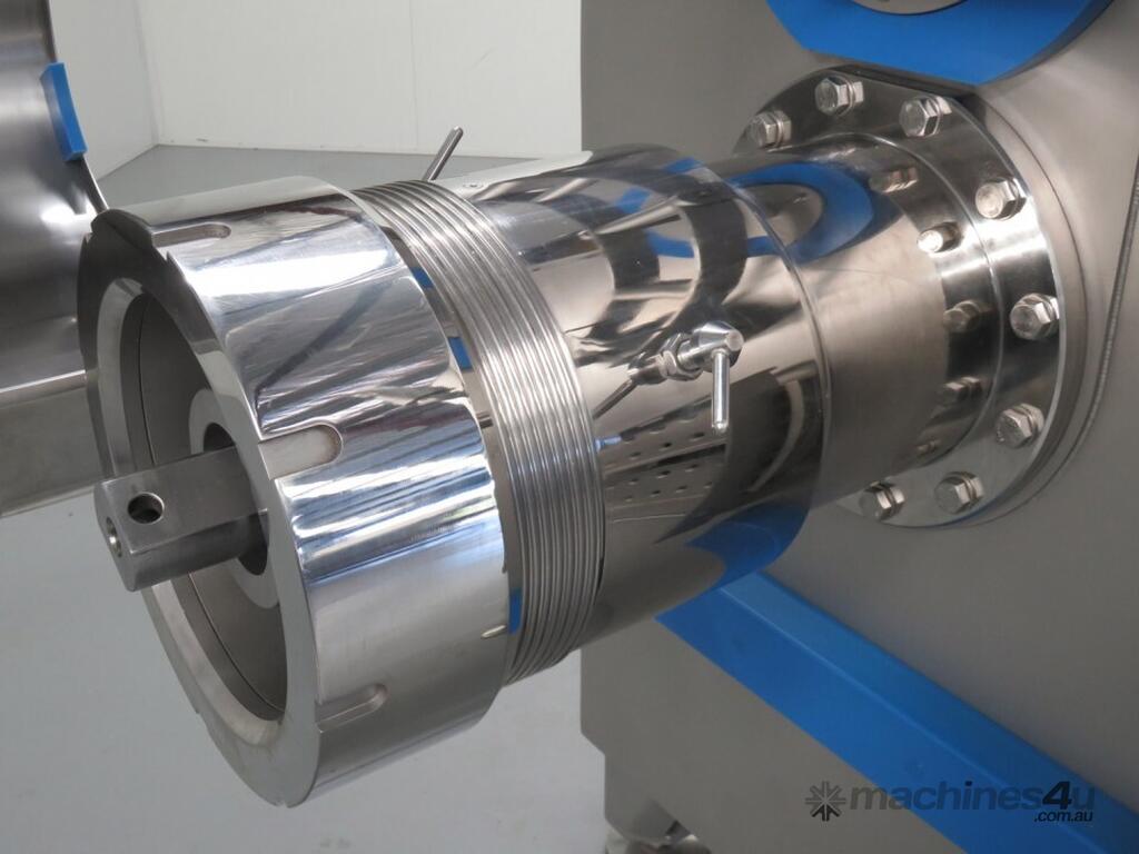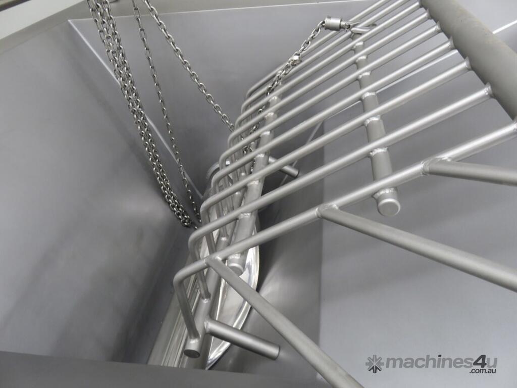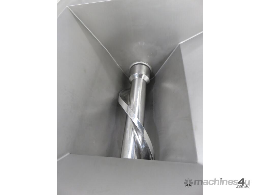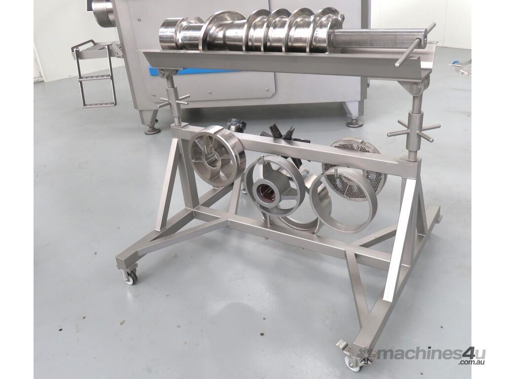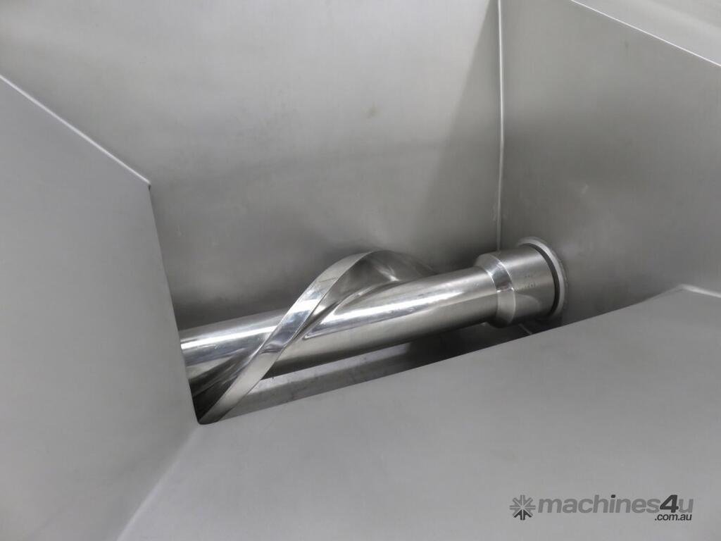 Worm ScrewVariable speed worm screw. Cuts blocks rather than breaking them up resulting in less fines and dust.Fresh, Tempered or FrozenCapable of effortlessly grinding both fresh meat and frozen blocks down to -18c in temperature.Knife Set ConfigurationsSingle or double knife set configurations possible. Crane DavitIntegrated crane davit for heavy duty lifting of machine tools.Hinged HatchProviding easy access for cleaning and maintenance.Trip BarHopper trip bar with rocker switch provides safety on the input of the machine. Inspection StepStep and mirror provide for easy inspection during maintenance and production.Accessory TrolleyTrolley for the easy storage and transportion of tools. Aids in handling while dismantling and for the cleaning of the parts.Optional: Incline ConveyorWe provide both bin lifters and incline conveyors to aid in the loading of blocks and products in to the hopper. Dual auger grinderFresh soft meats and fats, as well as tempered or hard frozen blocks are e?ectively processed together or separatelyVariable speed worm screwSingle or double knife setPulley chain hoist (crane davit) for ease of liftingHatch at front for accessiblity and cleaningSwing away arm with digital computer controlsPerfect fne and coarse grind, both fresh meat and frozen meat blocks15kW 27.4A motor on feeding screwPowerful 90kW, 150A large motor on grinding screwRobust designInspection step and mirrorAccessory trolleyOptional: Bone/sinew removal sytemOptional: Incline loading conveyorOptional: 200L/300L bin lifter