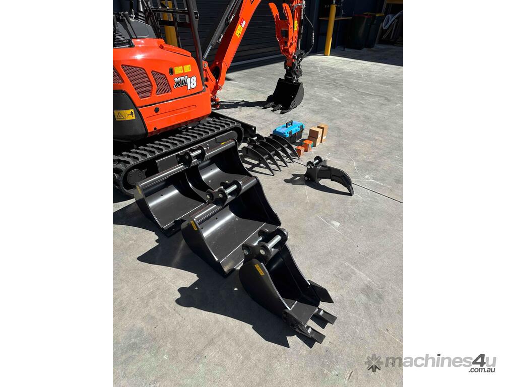 8 X ATTACHMENTS ( 200,300,600MM & 1000MM BUCKETS, RIPPER, RAKE, HYDRAULIC THUMB GRAB HYDRAULIC QUICK HITCH )