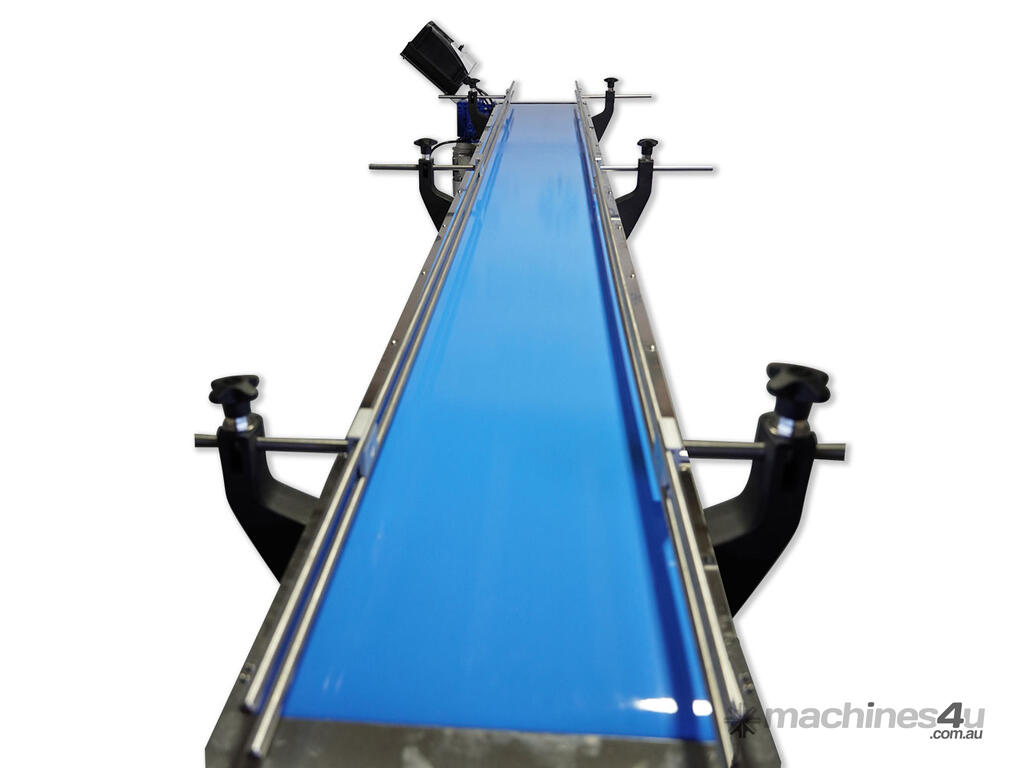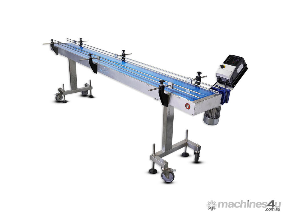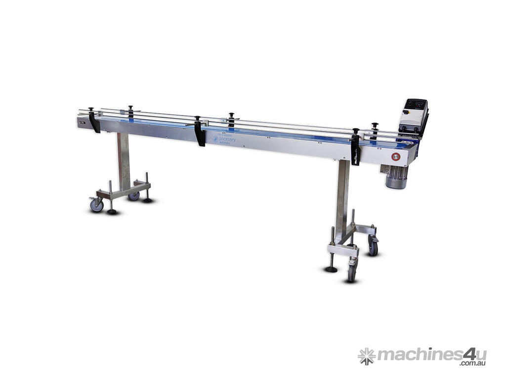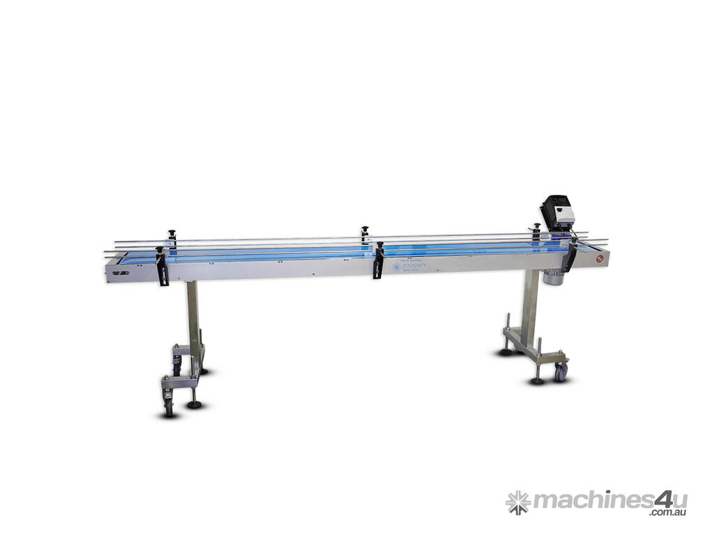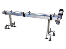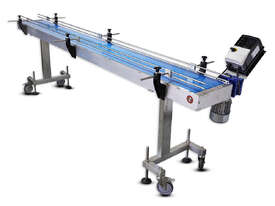 Containers are normally fed to the conveyor to assist with other production line systems such as filling, capping, labelling, marking and sealing. The belt of this conveyor is 300mm in width.