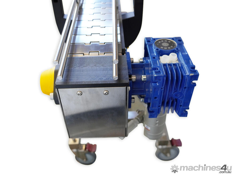 The 316 stainless steel frame is mounted on top of castors/wheels to allow for unparalleled manoeuvrability, furthermore this machine features levelling jacks on rubber feet to allow traction and height adjustment of the entire conveyor to suit any production line.