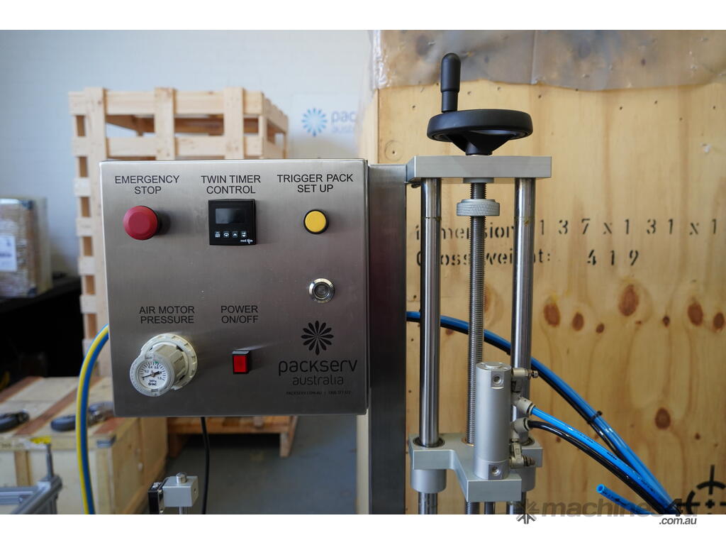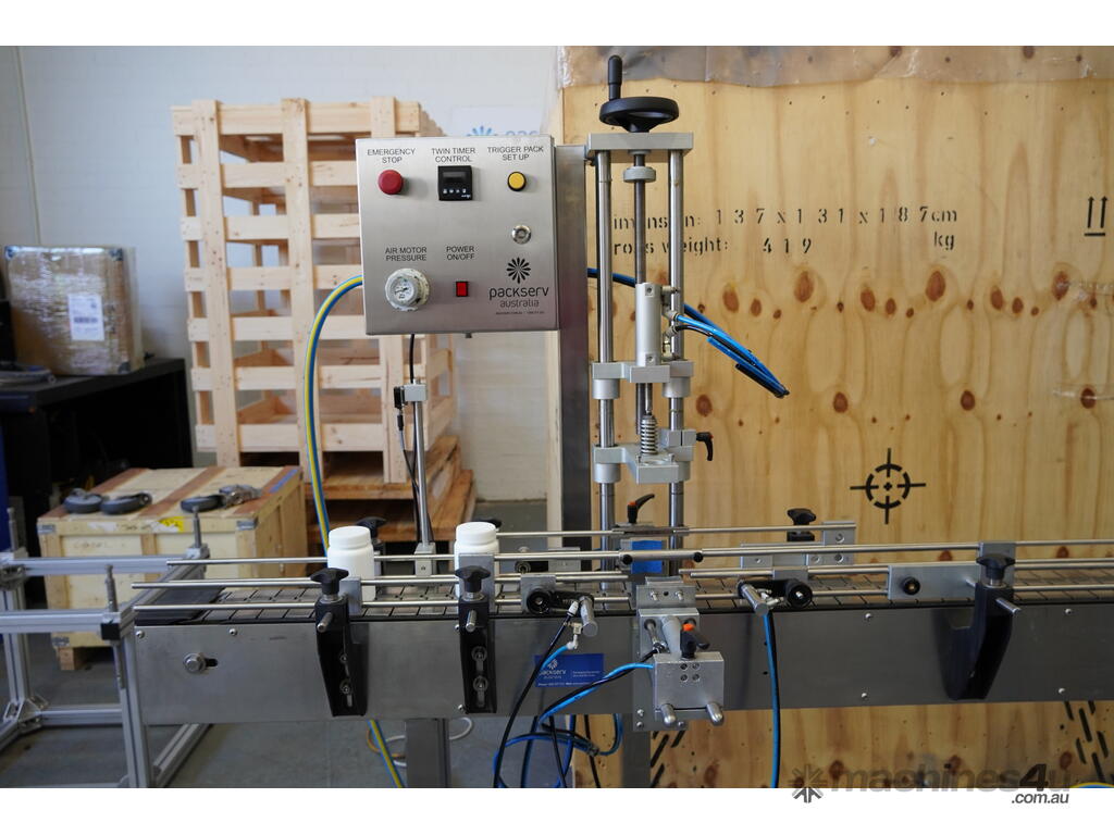 The Packserv PCM-1A-E conveyor mounted auto capper is the perfect unit for the capping of almost any style of container closure whether screw-on, push-on, trigger-pack or spray-pack. This unit features it's own sensor and gating system to ensure consistency and simplicity with rates of up to 60 units per minute.