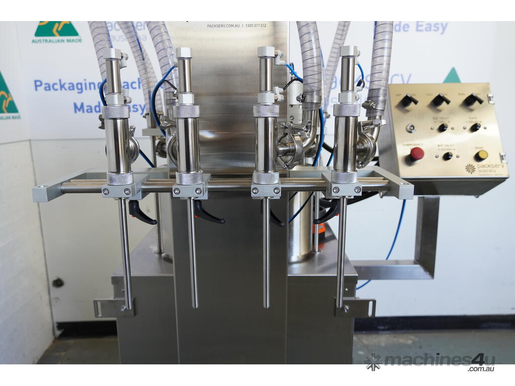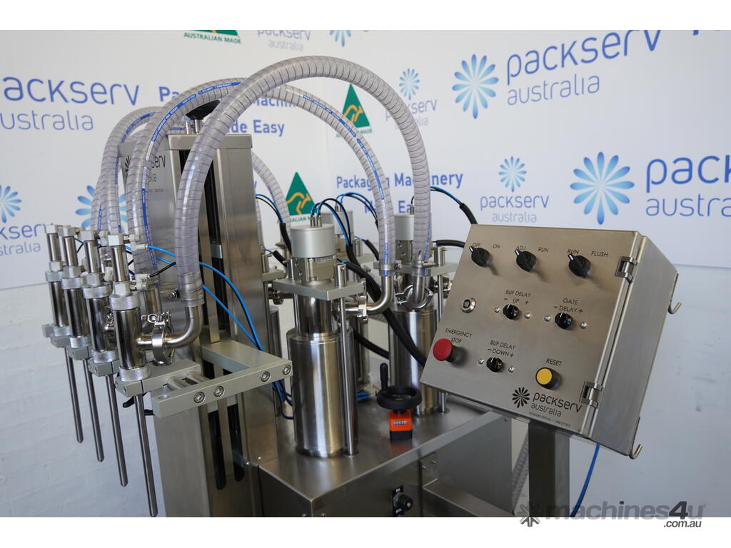 The Packserv PFM-4C Four Head Auto Filler is an automatic liquid and lotion filling machine that is both user friendly and versatile featuring 4 separate filling nozzles each capable of depositing up to 2L in volume per stroke.