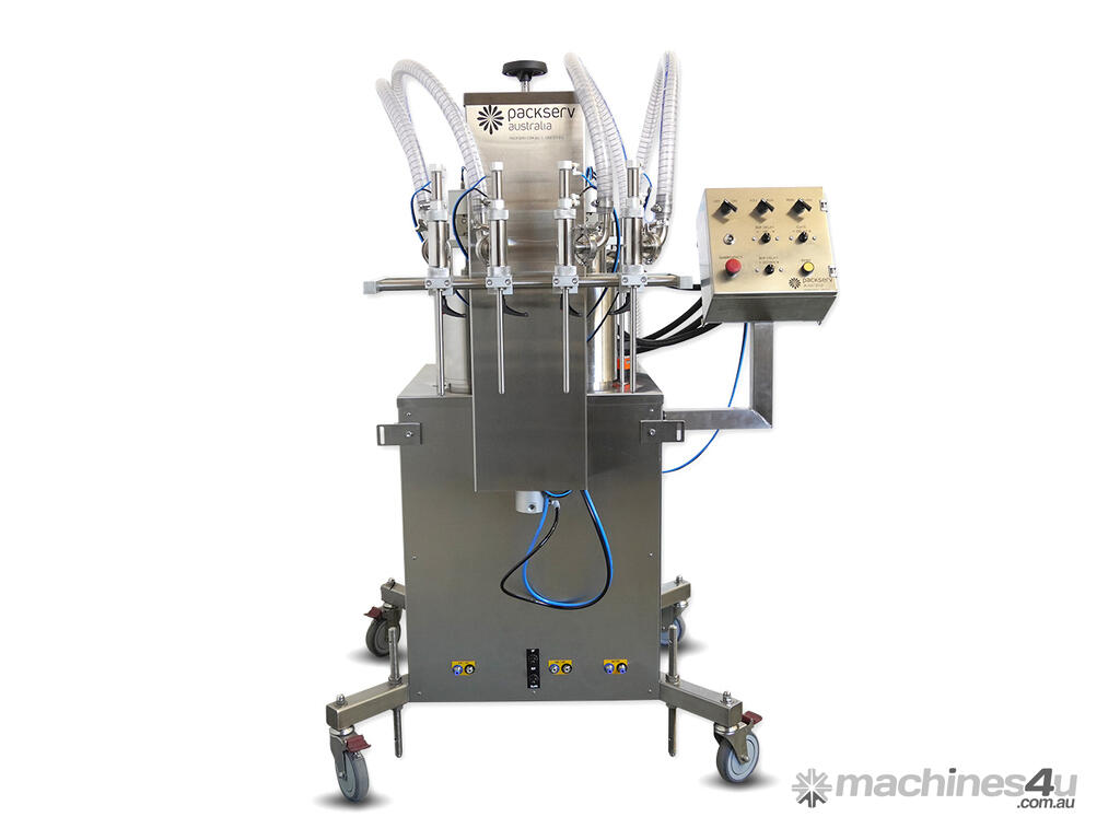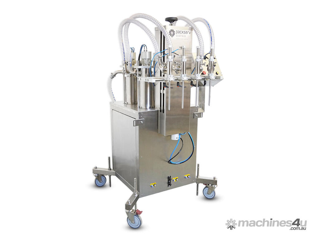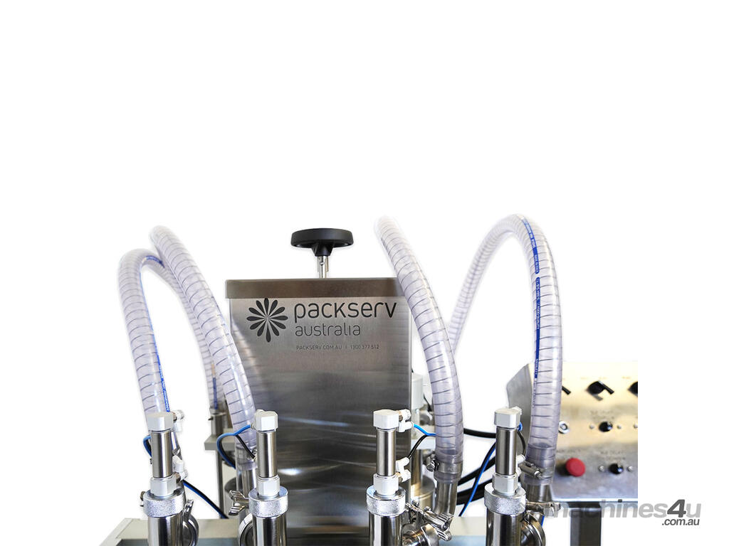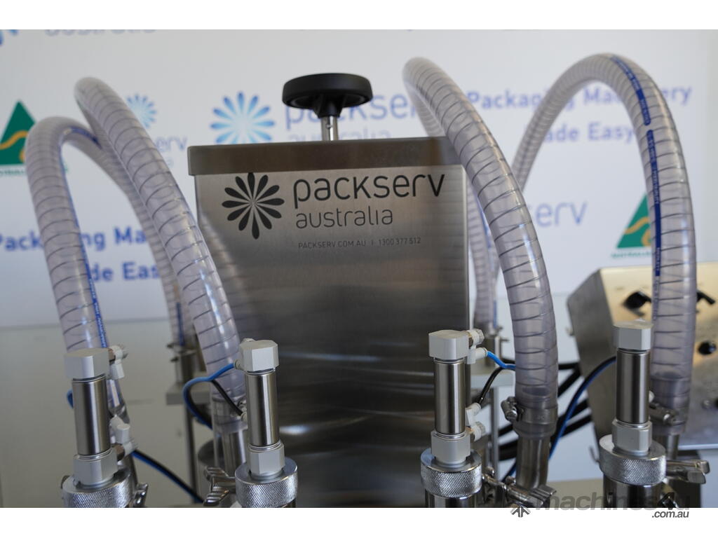 The Packserv PFM-4C Four Head Auto Filler is an automatic liquid and lotion filling machine that is both user friendly and versatile featuring 4 separate filling nozzles each capable of depositing up to 2L in volume per stroke. It has been designed for use as a heavy duty, all pneumatic automatic inline bottom up filling machine which offers reliability and ease of use with tool-free cleaning and parts change-over, that is both user friendly and versatile.