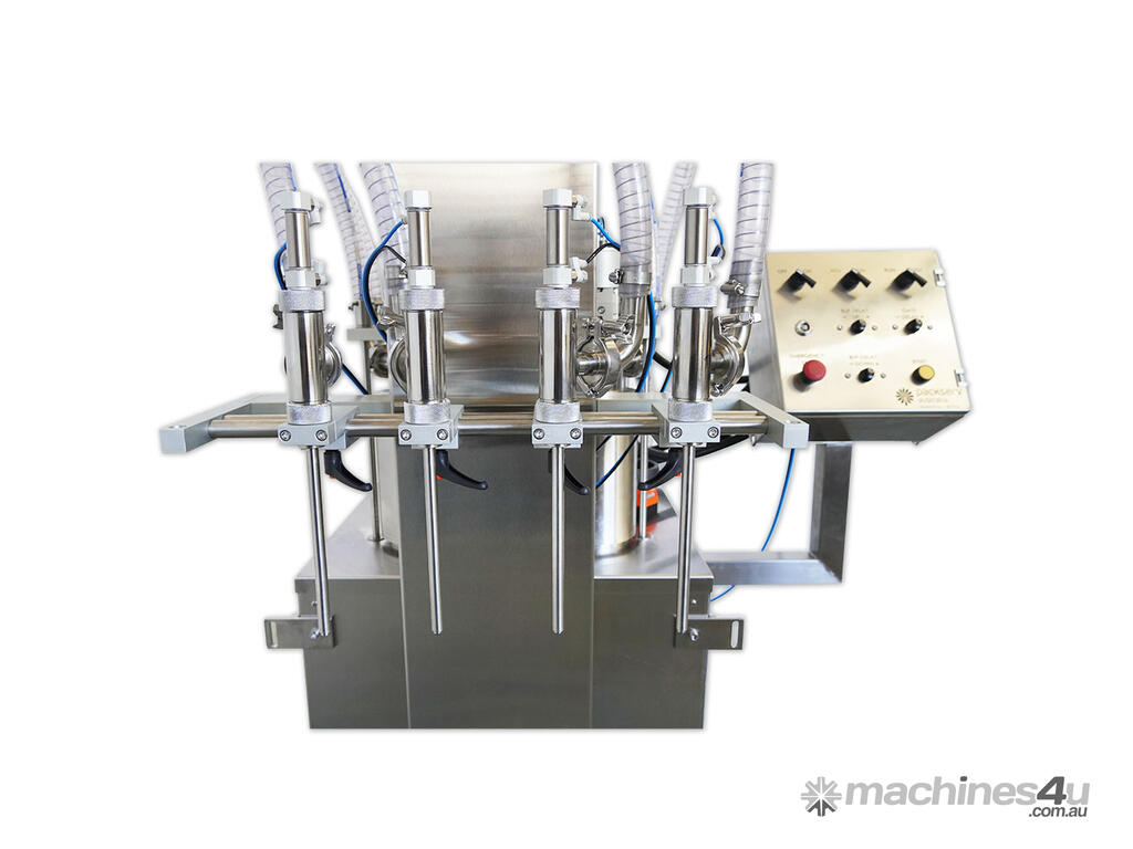 The cylinder design of the Four Head Auto Filler enables quicker dismantling and easier, more thorough cleaning of wet parts. The supply method of product to this machine is run through a stainless steel manifold system connected preferably by 2" or 3" transfer hose connected to a storage/mixing vat or IBC.