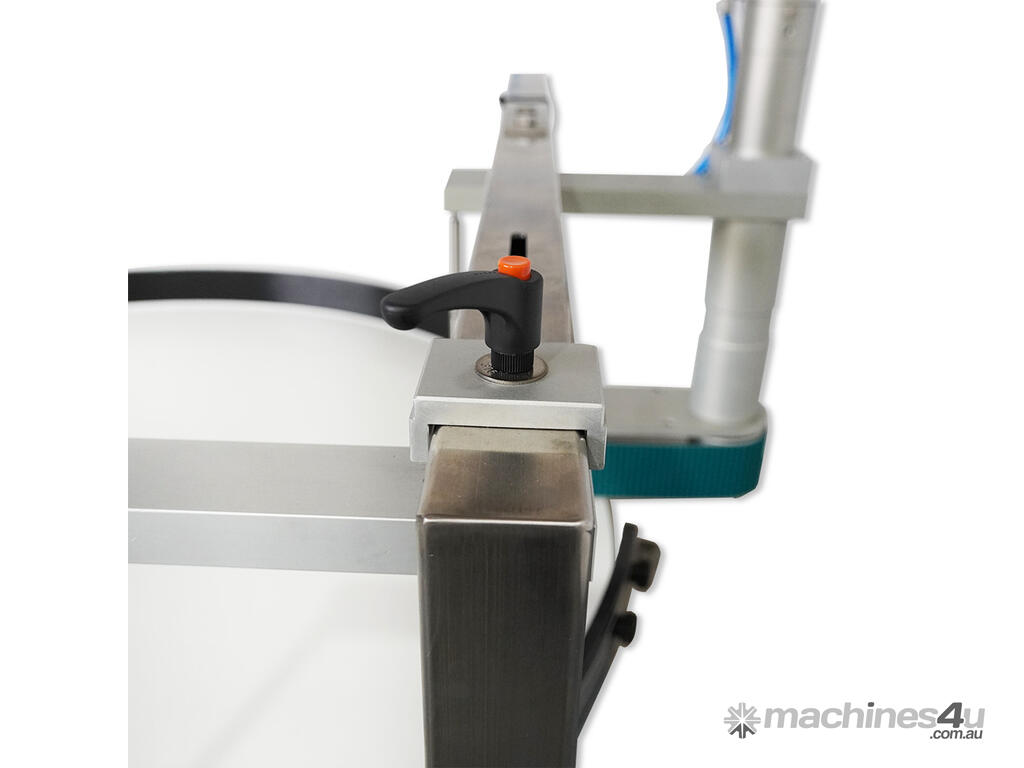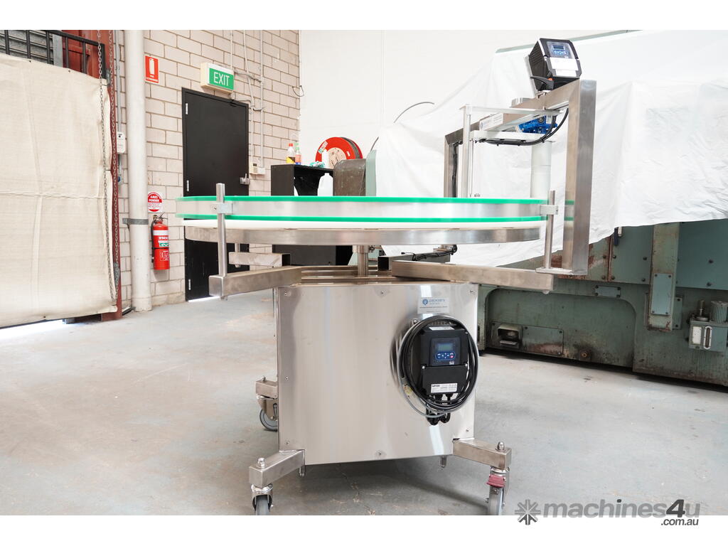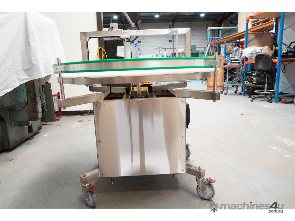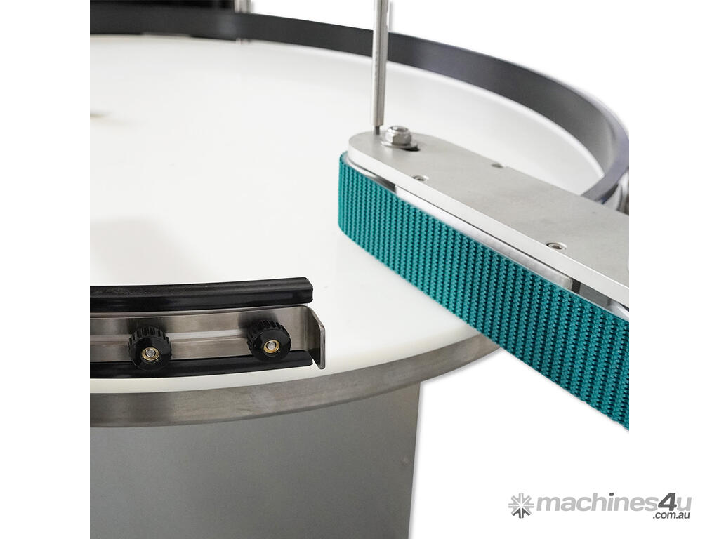 Finally, the table features a photoelectric sensor which after a time-delay signals both the tabletop and transfer belt to stop operation to prevent a build-up of containers on your conveyor line.