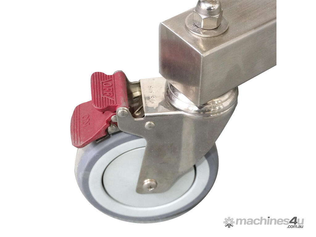 This table features a robust and durable 316 stainless steel design to ensure an endurable product requiring minimal maintenance. This table features levelling jacks and rubber feet to ensure the correct height is applicable for any line. Additionally, the frame is atop of lockable castors/wheels to ensure simple installation onto any line.