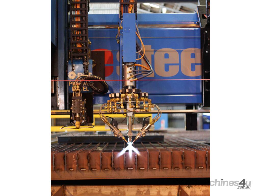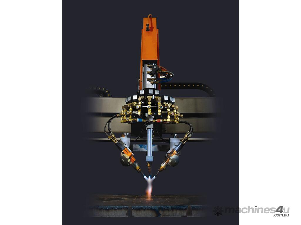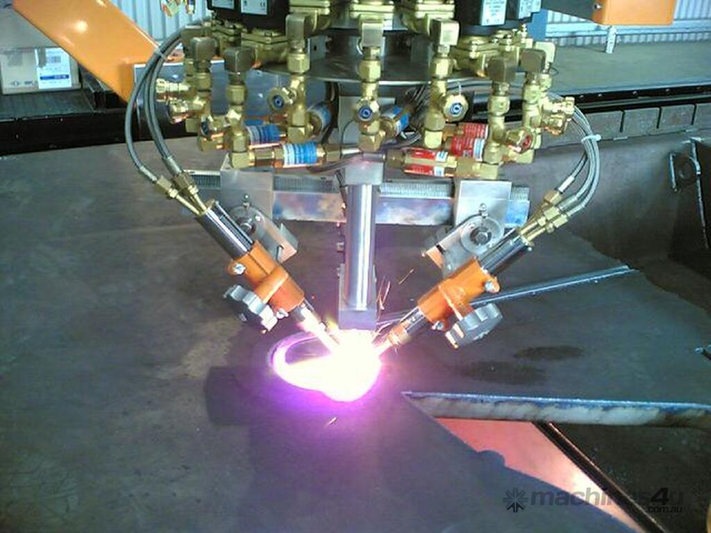 This unique PCS Oxy Bevel Head (a.k.a Plate Edge Preparation System, Triple Burner Head) combines 3 flame torches to cut bevels at the same time as cutting the component outline. 3 cutting torches rotate through 360° and a bevel angle of up to +45°. Infinite rotation is achieved via the use of a special air-cooled rotary chamber. Therefore the Oxy Bevel Head can rotate without twisting hoses/cables or the need to unwind itself.