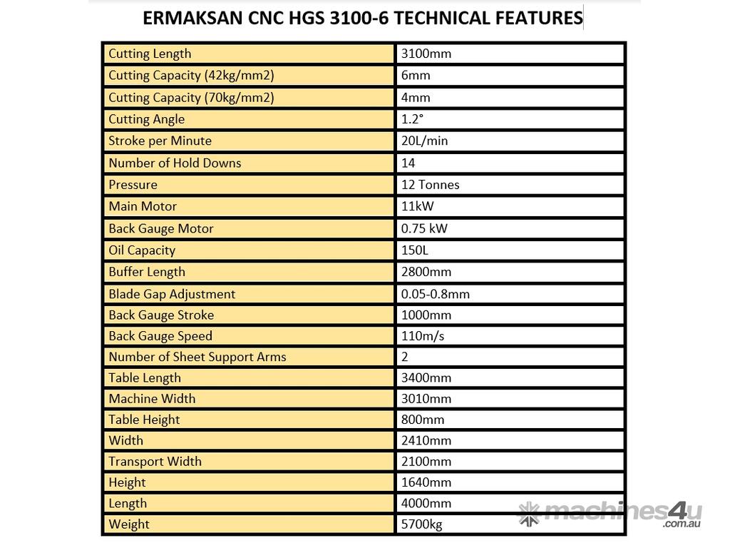 3100 x 6mm (mild steel) capacity: With a modern design, strong steel welded construction and perfect cutting quality, the European quality CNC HGS 3100-6 hydraulic guillotine is the ideal addition to your business.