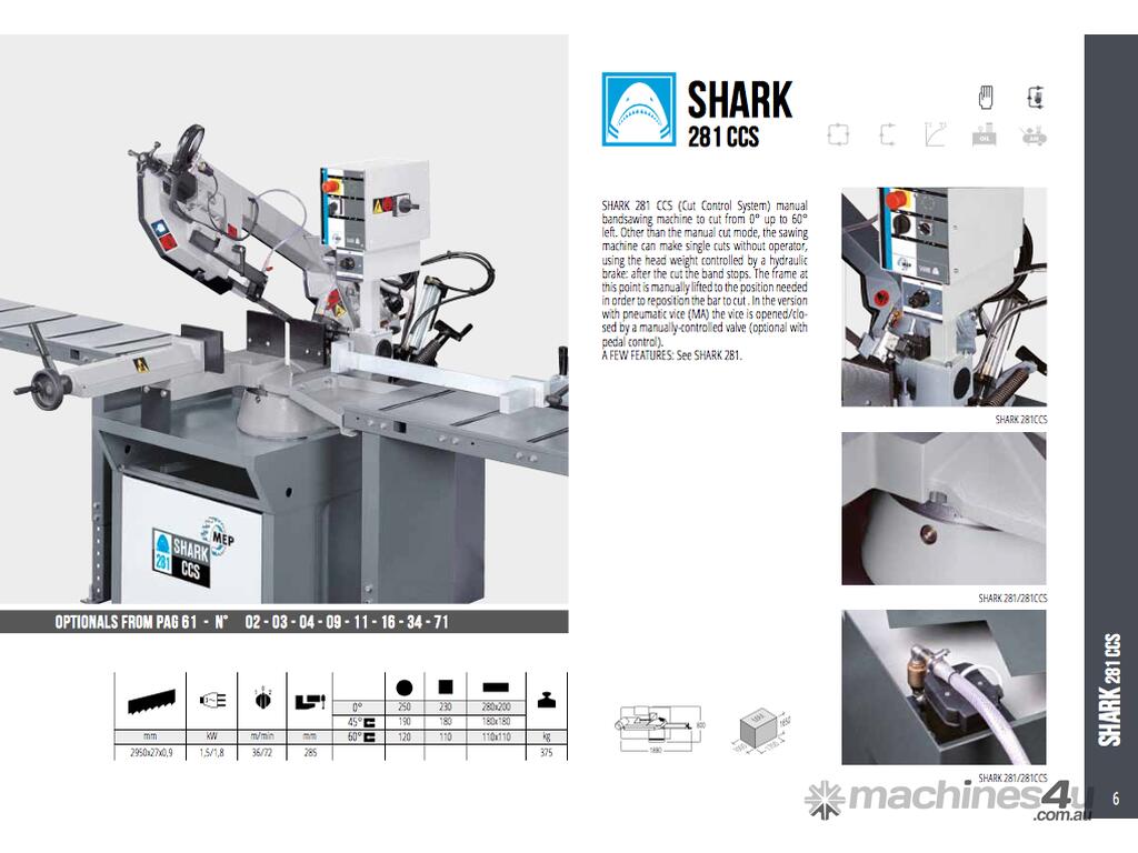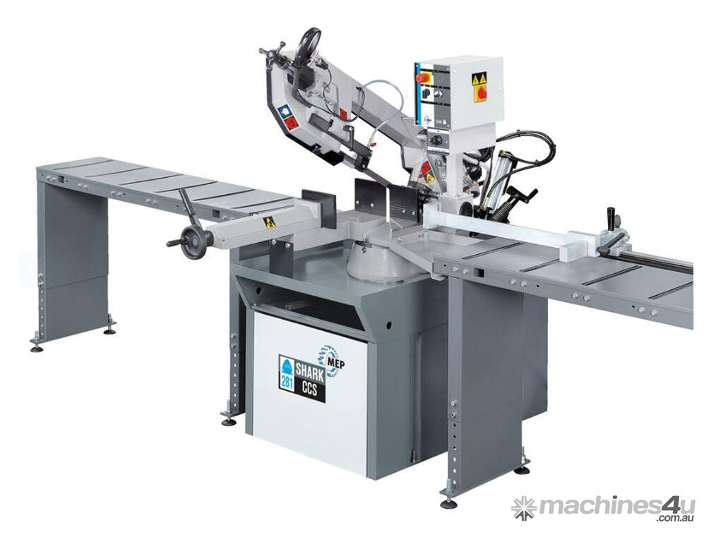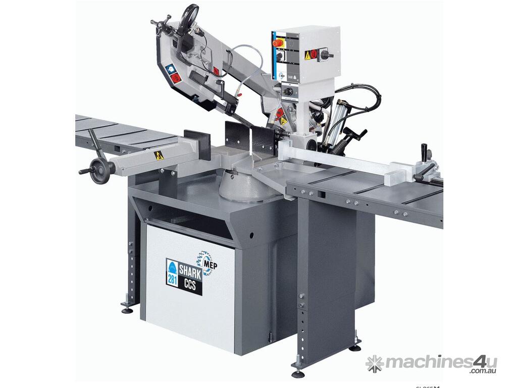 The MEP Shark 281CCS is a manual pull-down band saw machine which cuts metals mitering from 0° to + 60°, and can also perform single cuts without an operator.