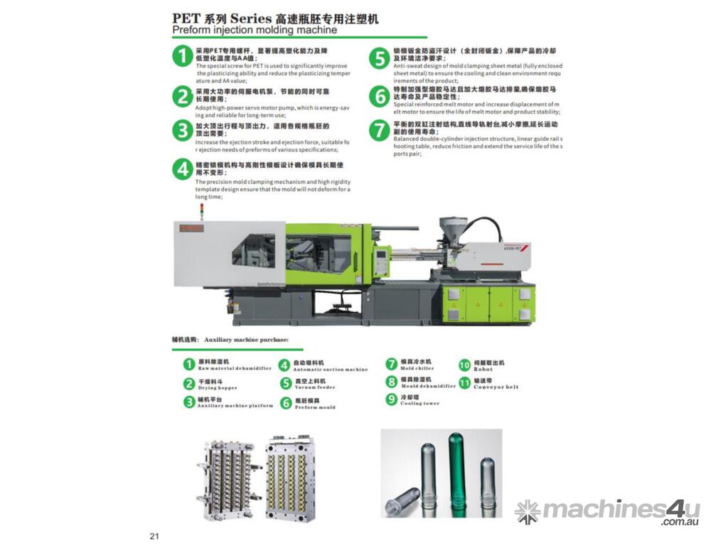 TEKWELL MACHINERY OFFERS THE PET SERIES INJECTION MOUDLING MACHINE FOR MAKING PET PREFORMS . CAPACITY RANGING FROM 170 TONS TO 650 TONS CLAMPING FORCE. THE SHOT CAPACITY RANGE FROM 548 GMS TO 4600 GMS.