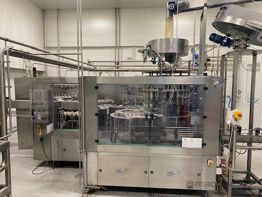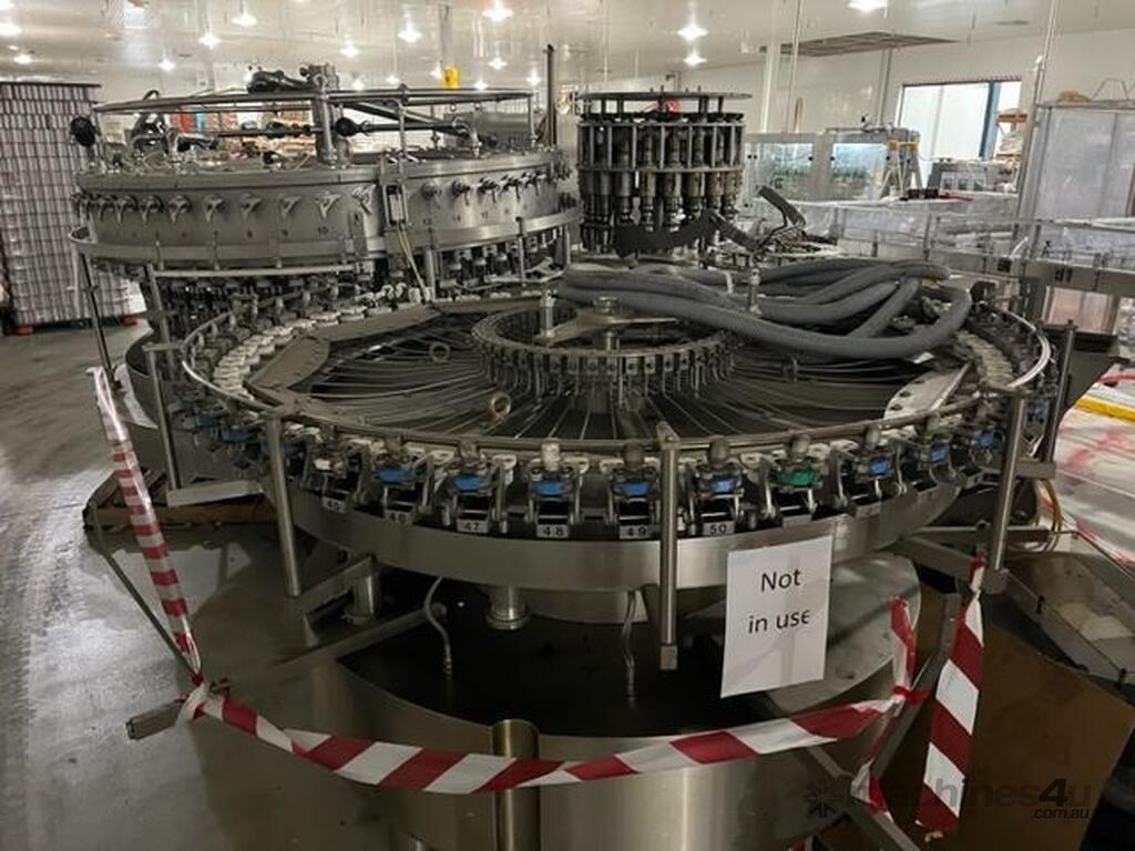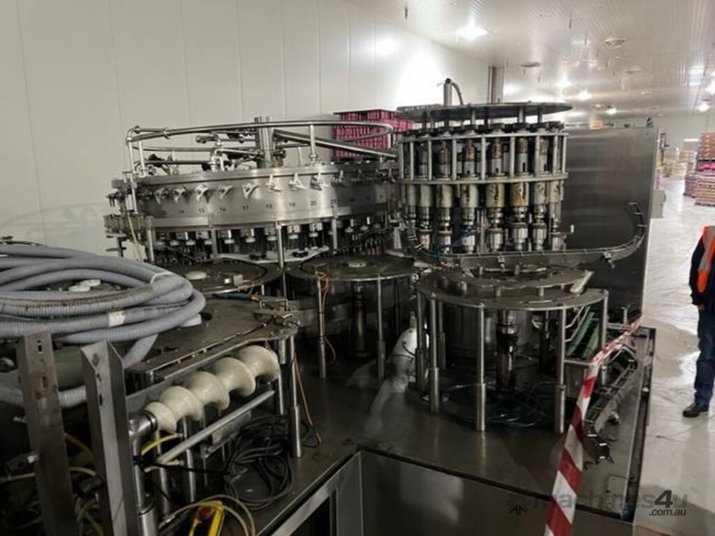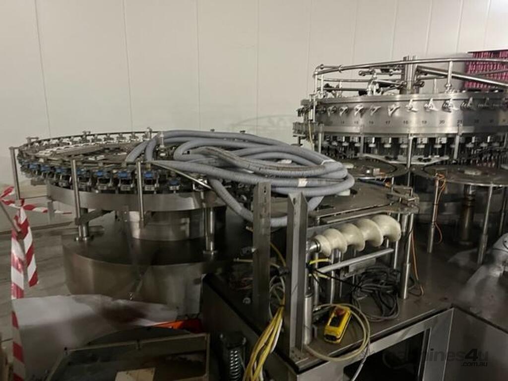 Pet Unibloc filler last used for water Suitable for water, fruit juices and isotonic drinks 50 head rinser 50 head filler 20 head capper 18kw power Max bottle dia 110mm 100-450 bottles per minute depending on bottle size. The gravity and vacuum filling system for non carbonated liquids are designed and manufactured using highly innovative technologies suitable to achieve the maximum precision in results, high production outputs, easy sanification, simplicity in operation and maintenance and reliability. The filling systems, according to the type of product and container to be handled, are manufactured with gravity system, light vacuum, direct vacuum, light pressure, electronic control system or the specific version for wine filling. More info about the filler can be found here.