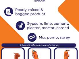 Brand new German made, PFT Ritmo L Plus. Mixing pump - also known as plastering machines or mortar pumps - continuously and fully automatically process all machine-compatible ready-mix dry mortars based on gypsum, lime and cement with water. PFT offers several model ranges, including the RITMO family. The machine can be loaded with buckets or bagged material and can be used as a mixing pump or pump. As RITMO L plus FC-230V, the one-person mixing pump gains above all in all-round qualities and flexibility. The strengths include particularly easy handling, an optimised material flow and a very low weight, which facilitates the transport of the compact machine. Accessories such as the PFT DUSTCATCHER protect the operator from high dust exposure. The pump capacity of the RITMO L plus FC-230V is infinitely variable.