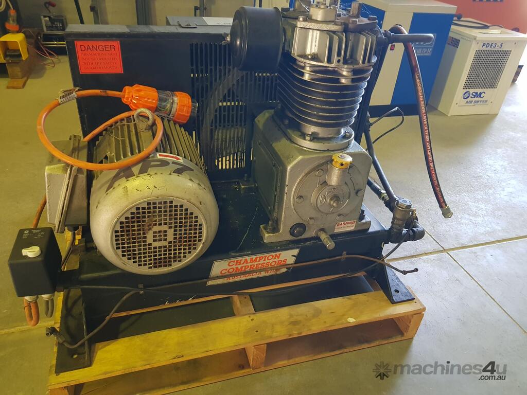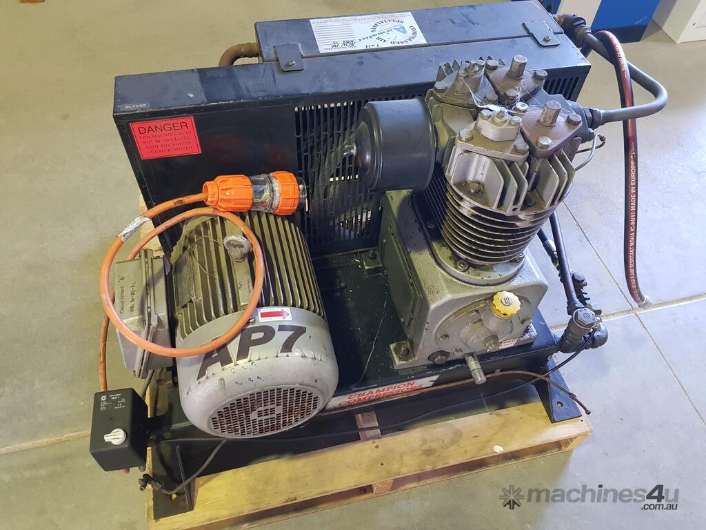 4). CHAMPION AP7 5.5Kw 7.5hp 415v PISTON COMPRESSOR BASE MOUNT, BLUE/SILVER/BLACK COLOURS, IN-BUILT AFTER COOLER, HEAVY DUTY, MADE IN AUSTRALIA, ITALIAN CAST IRON PUMP, VERY GOOD WORKING CONDITION