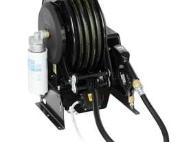 Dispenser unit with automatic hose reel; 15 metres of hose with automatic nozzle allow dispensing up to 45 l/min with DC power supply.