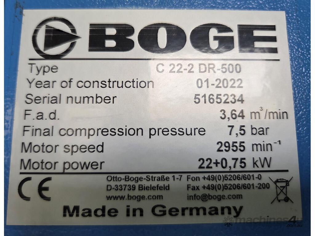 7). BOGE C-22-2 DR-500 22kw 30hp 415v 7.5 BAR 128.5CFM 3-IN-1 ROTARY SCREW COMPRESSOR Year 2022 MADE IN GERMANY INCLUDING BUILT-IN REFRIGERATED AIR DRYER 240v/FILTERS MOUNTED ON 500 LITRE GALVANISED AIR RECEIVER TANK, SUPER QUIET, HEAVY DUTY, GENUINE LOW RUN HOURS, VIRTUALLY ‘NEW’ CONDITION