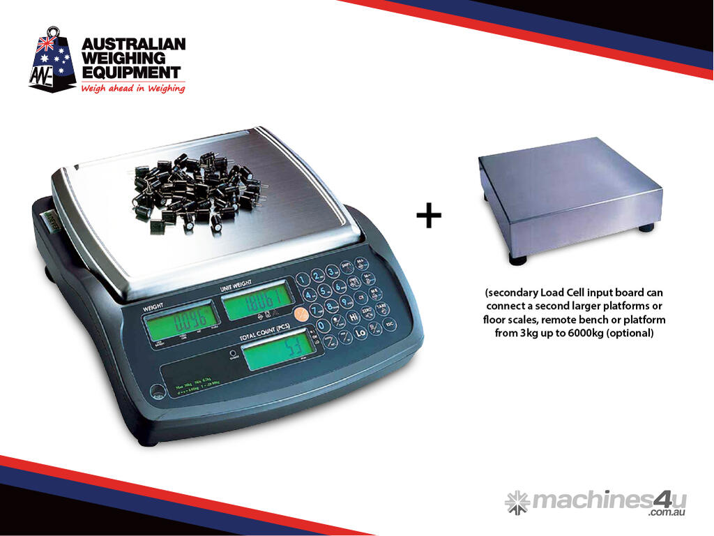 • With the secondary Load Cell input board you can connect a second larger platforms or floor scales. Remote bench or platform: From 6kg up to 6000kg (Optional)