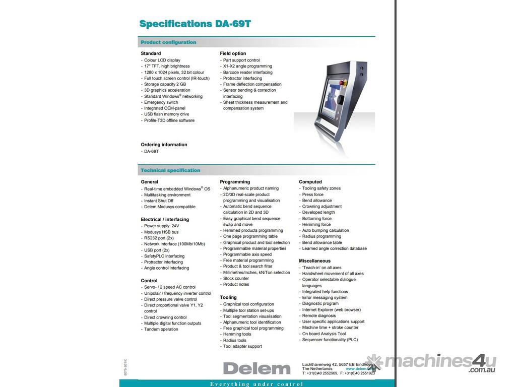 • Controller is the top-of-the-line Delem DA69T from Holland. This will future-proof your workshop with 3D Touch screen graphic programming and the ability to import CAD files.