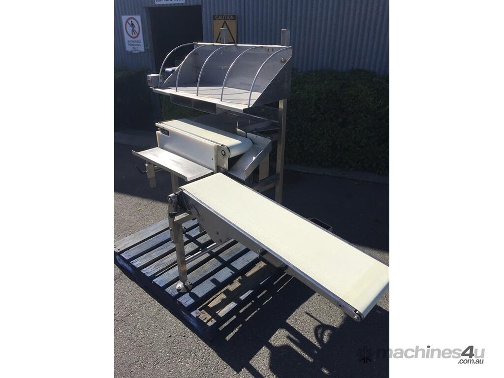 Packing station with two conveyors, and st/steel shelf, all stainless steel, ex Food factory.