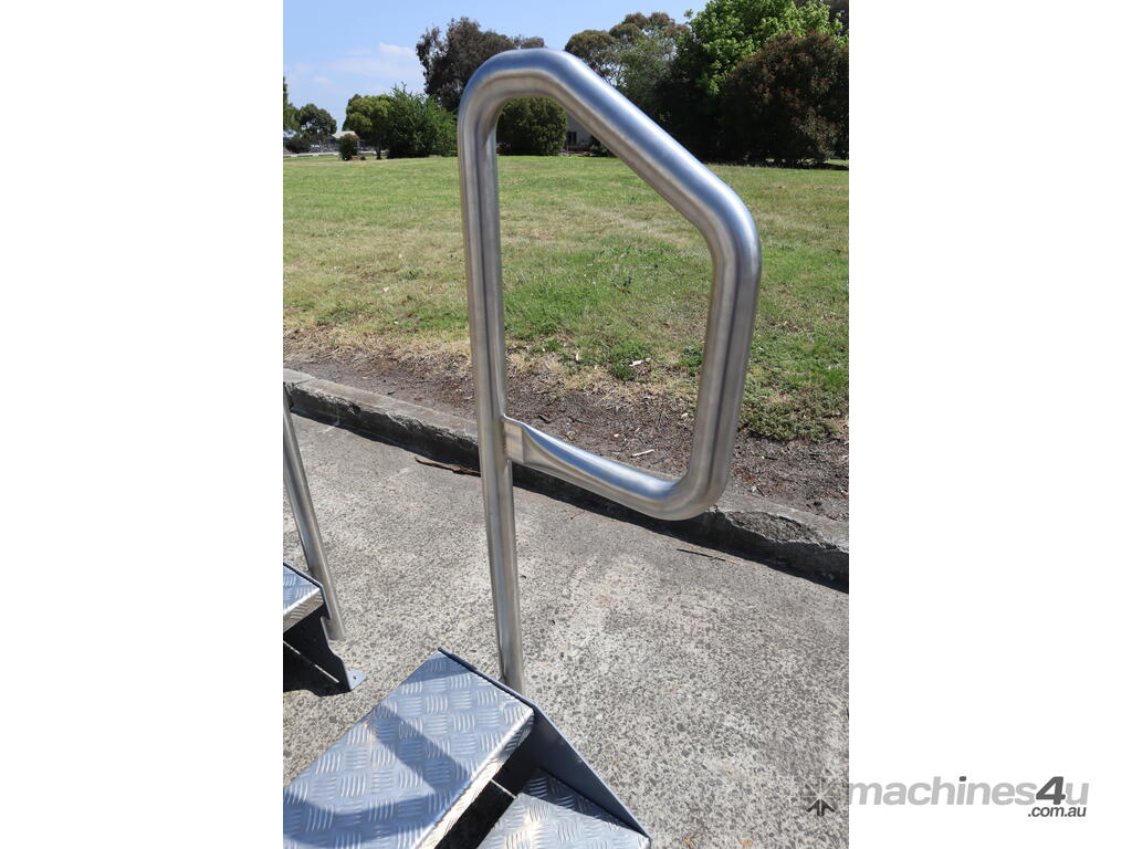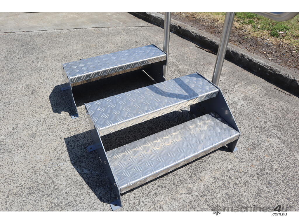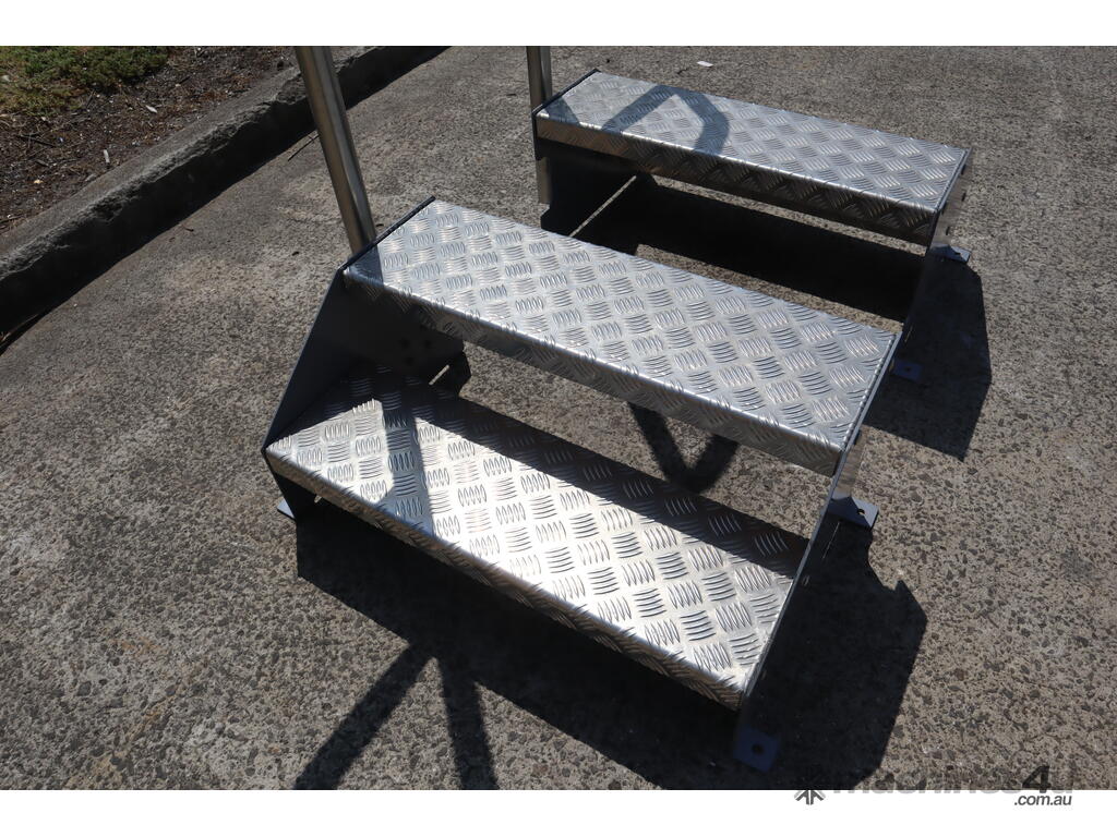 Selling a pair of aluminum steps with stainless steel rails. Checkerplated steps with a width of 800mm, these steps offer secure and comfortable access. The aluminum construction ensures durability, while the stainless steel rails provide additional support.