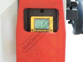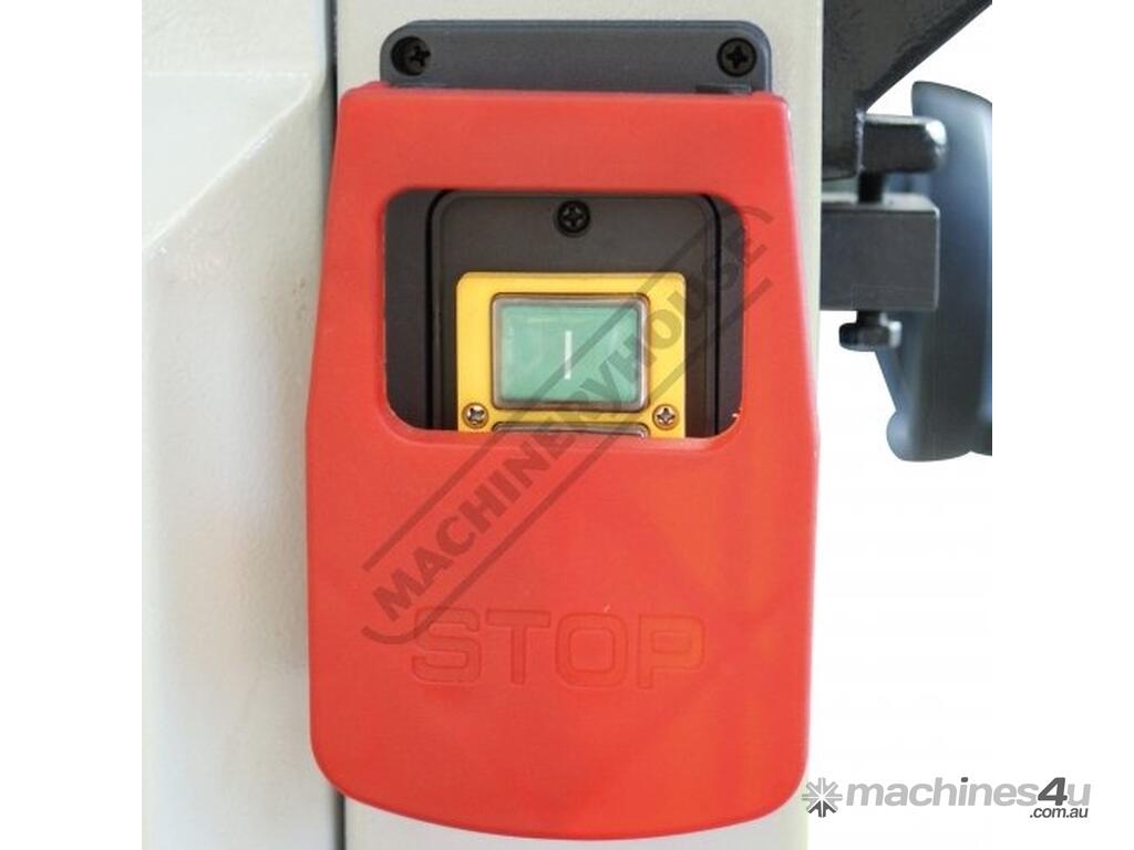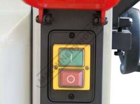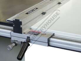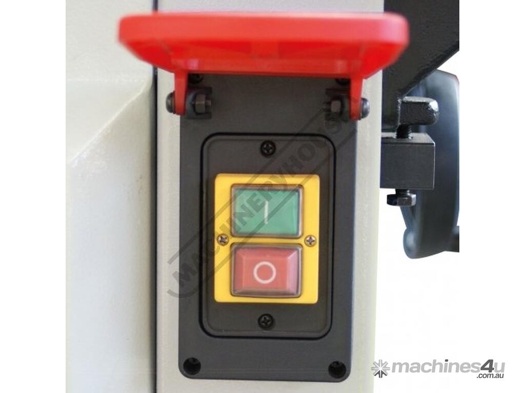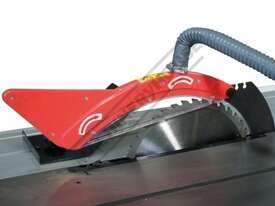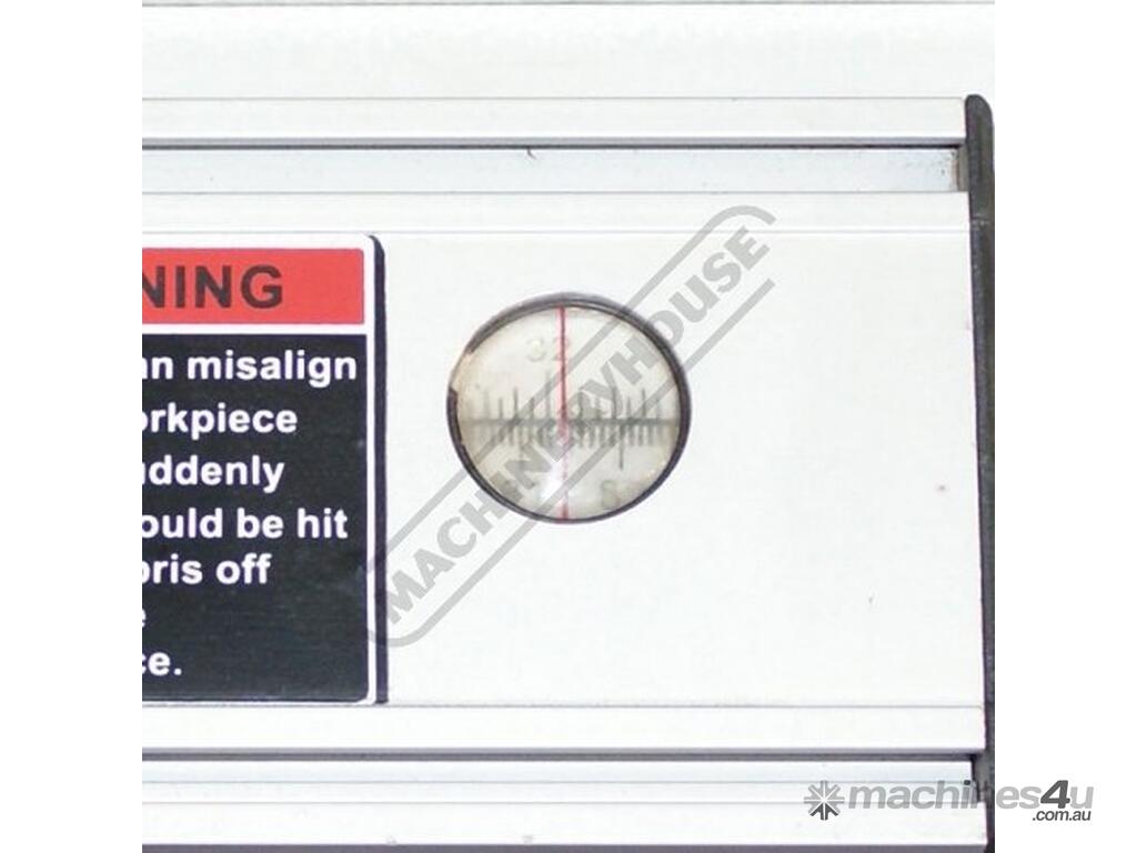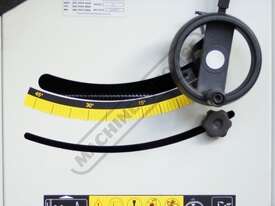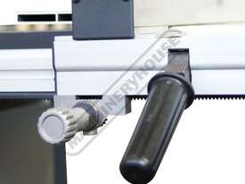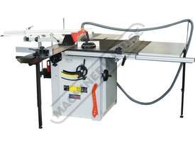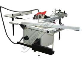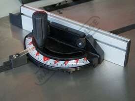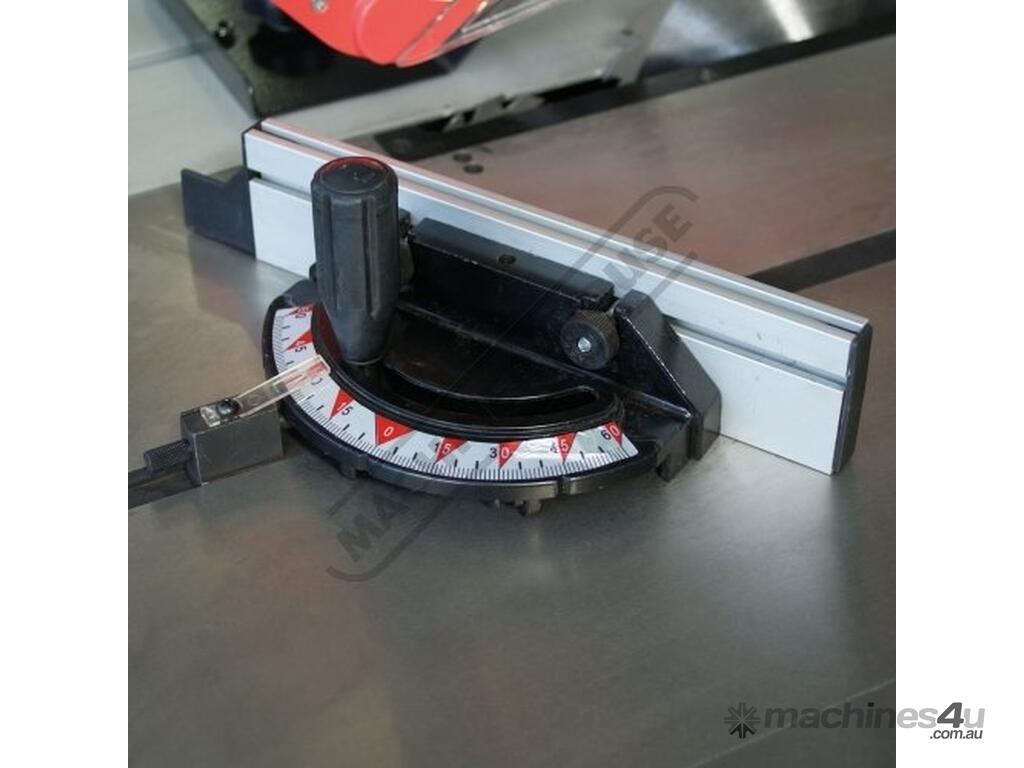The main table is heavily webbed cast iron which provides a rigid mounting point for the 315mm main blade and a 90mm scoring (scribe) blade. The table also has sheet metal side and rear extensions to increase working area to 1260 x 800mm. Ample power is provided by the 3kW / 4hp 240V induction motor to drive the blades through the most stubbornness timbers. The whole motor frame is a substantial cast iron unit with the blade height and tilt mechanisms being particularly very smooth in action when adjusted to desired height or angle. This great machine is supplied with a rip fence, mitre fence with work clamp and both main & scribe blades.