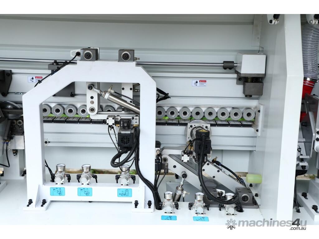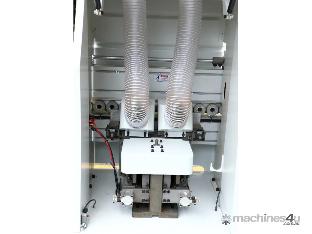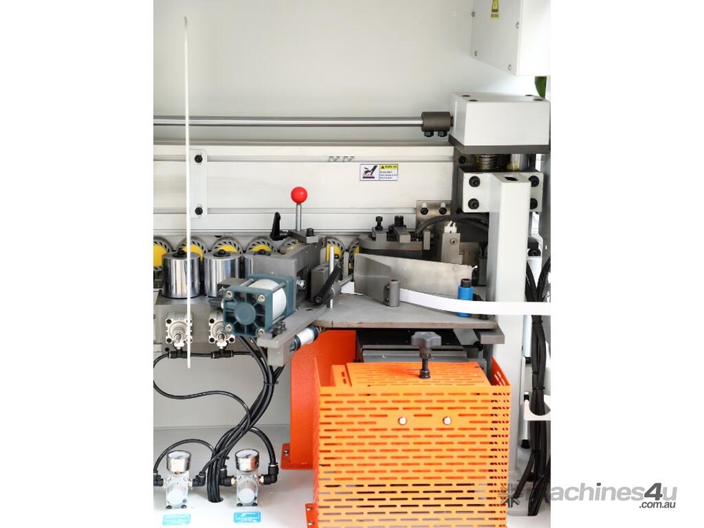 The PE-412 Edgebander gives total finished edge with every working station you can possibly fit in a Edgebander. With the Premilling for perfect Board To Edge Joint. Then finished with Glue and Radius Scraping.