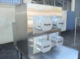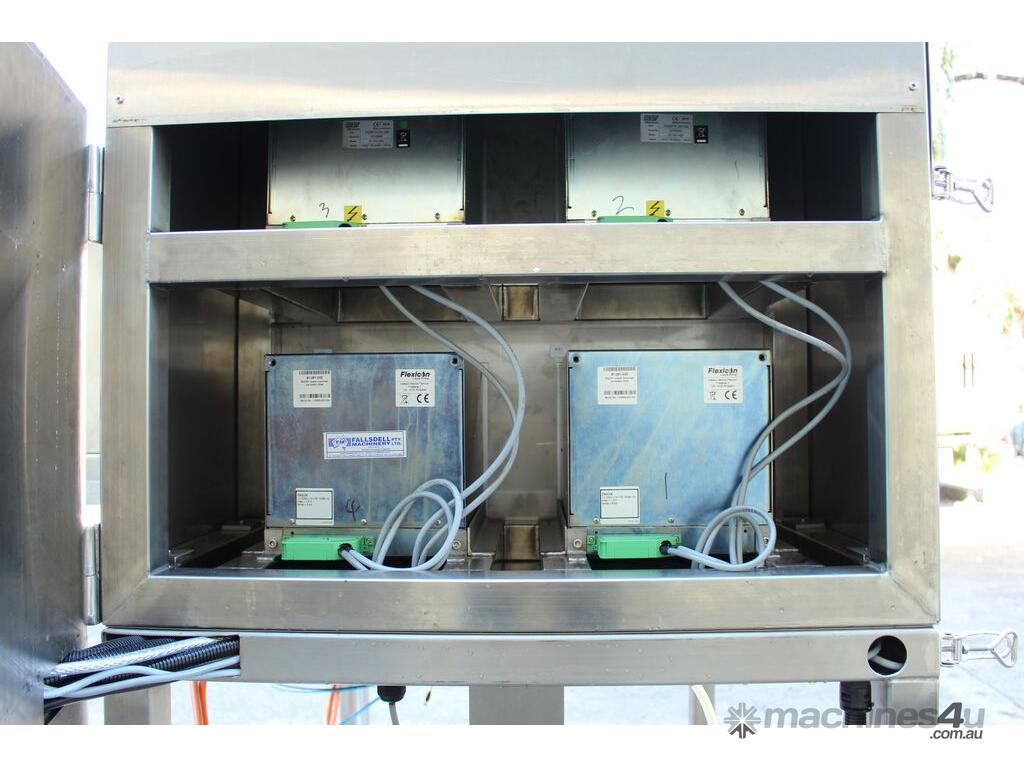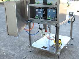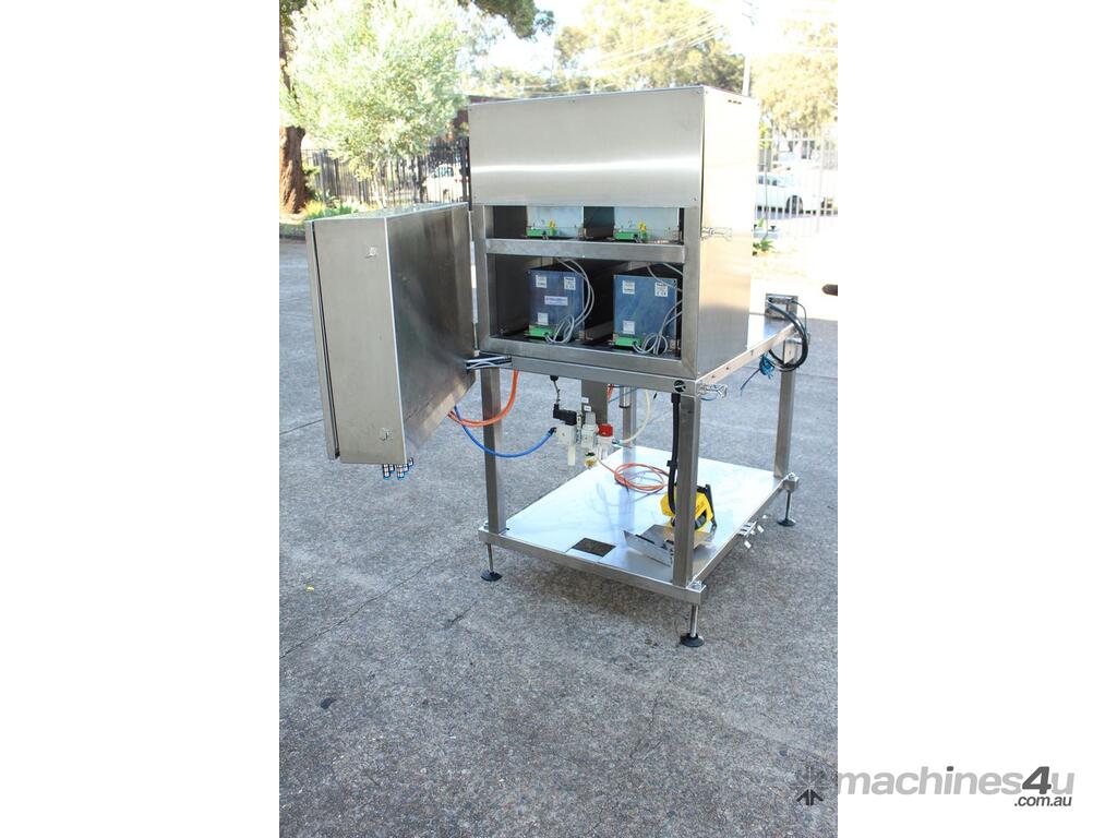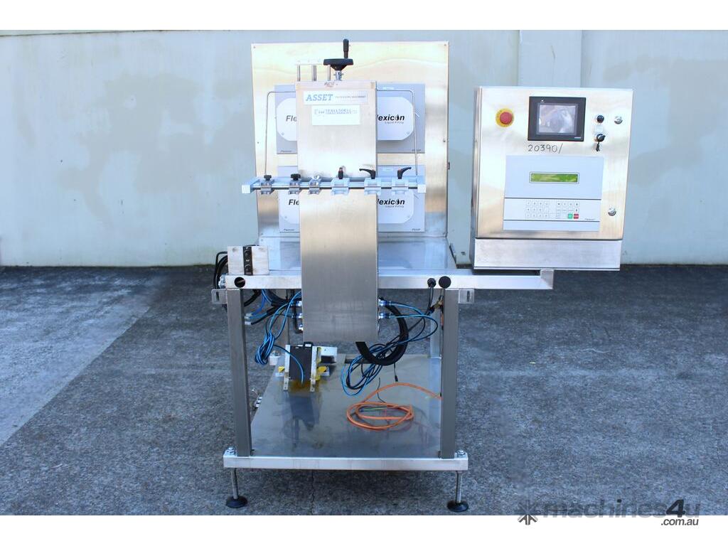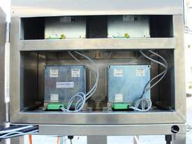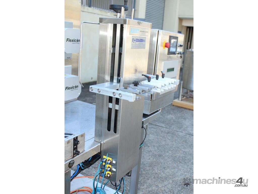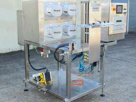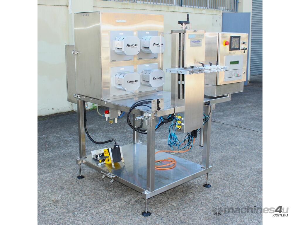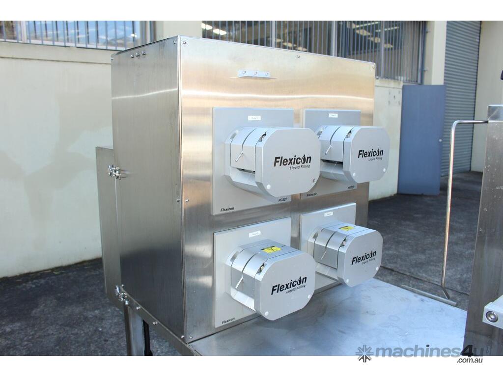 Peristaltic 4 Head Liquid Filler, "Flexicon", model PD22P, provided with 4 individual peristaltic pumps, complete with Flexicon control panel, "Asset" bottom up filling device and configured to take Asset positive shutoff nozzles, not included. Stainless steel frame, overall dimensions (L x W x H): 1550mm x 1400mm x 1700mm