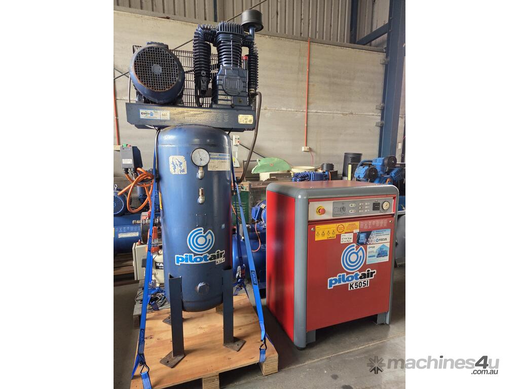 7). PILOT K100 15kw 20hp 415v INDUSTRIAL RECIPROCATING AIR COMPRESSOR MADE IN AUSTRALIA SLOW-REVVING HEAVY DUTY ITALIAN CAST IRON PUMP 500 LITRE AIR RECEIVER TANK. STAR-DELTA SWITCH FOR EASY START-UP.