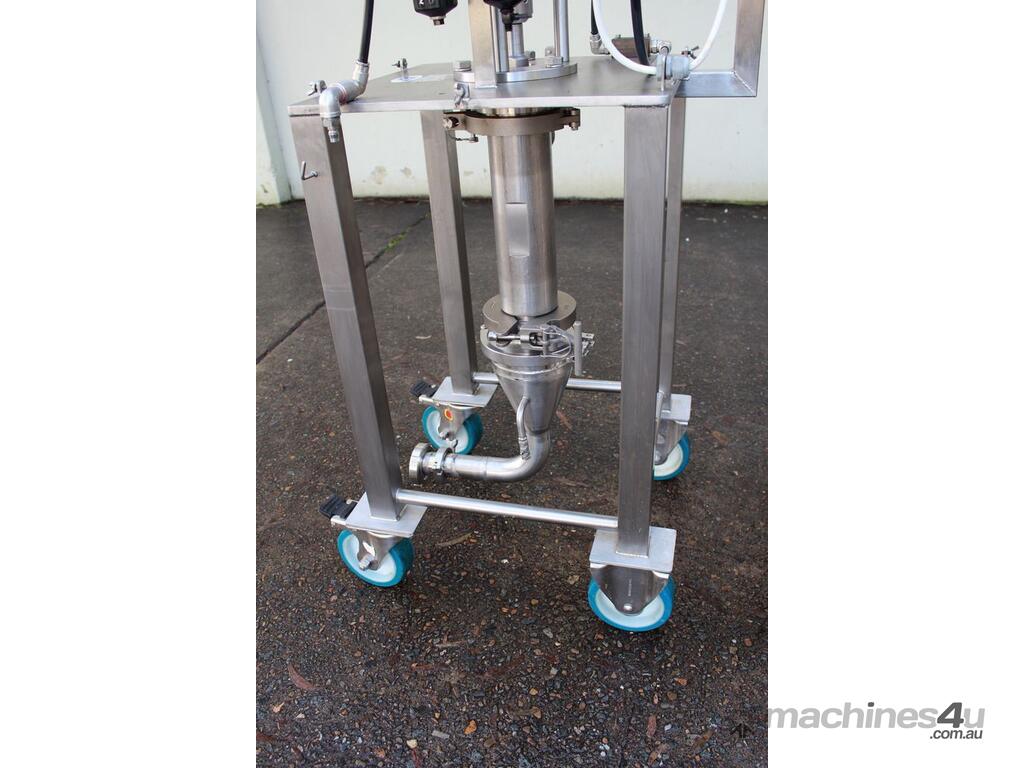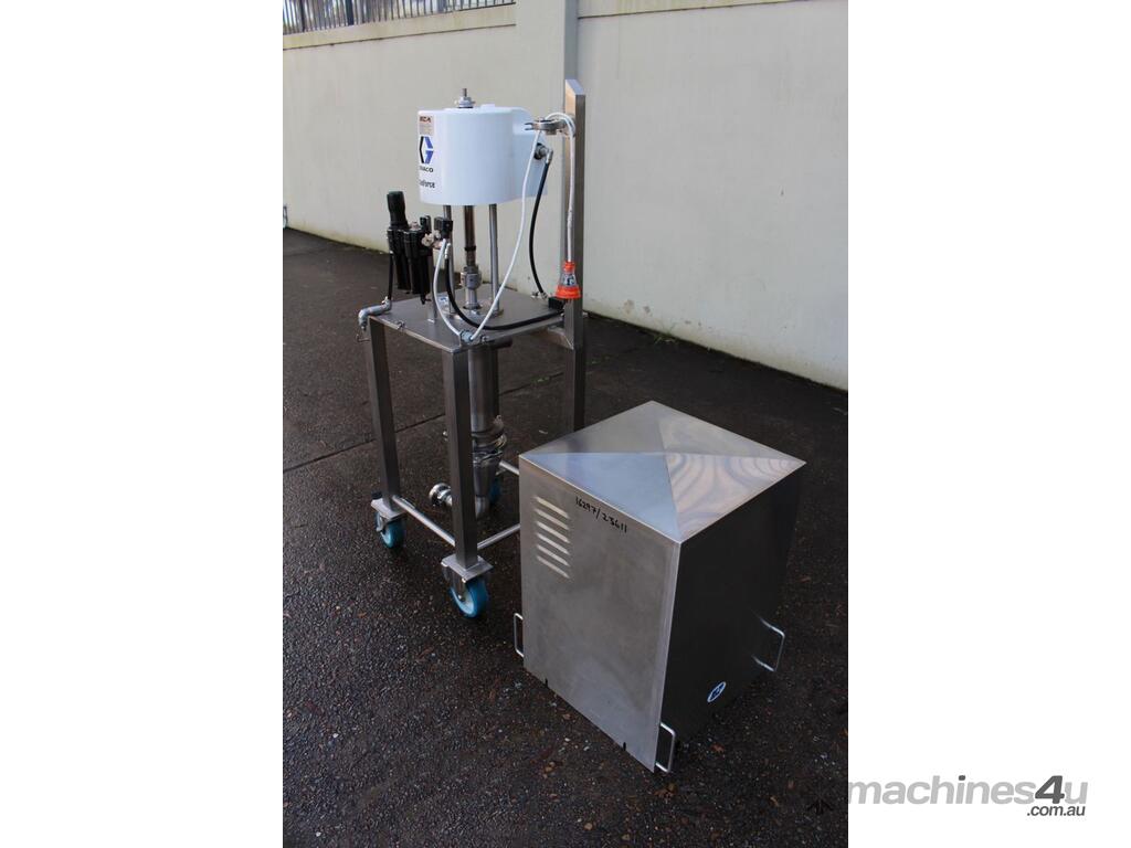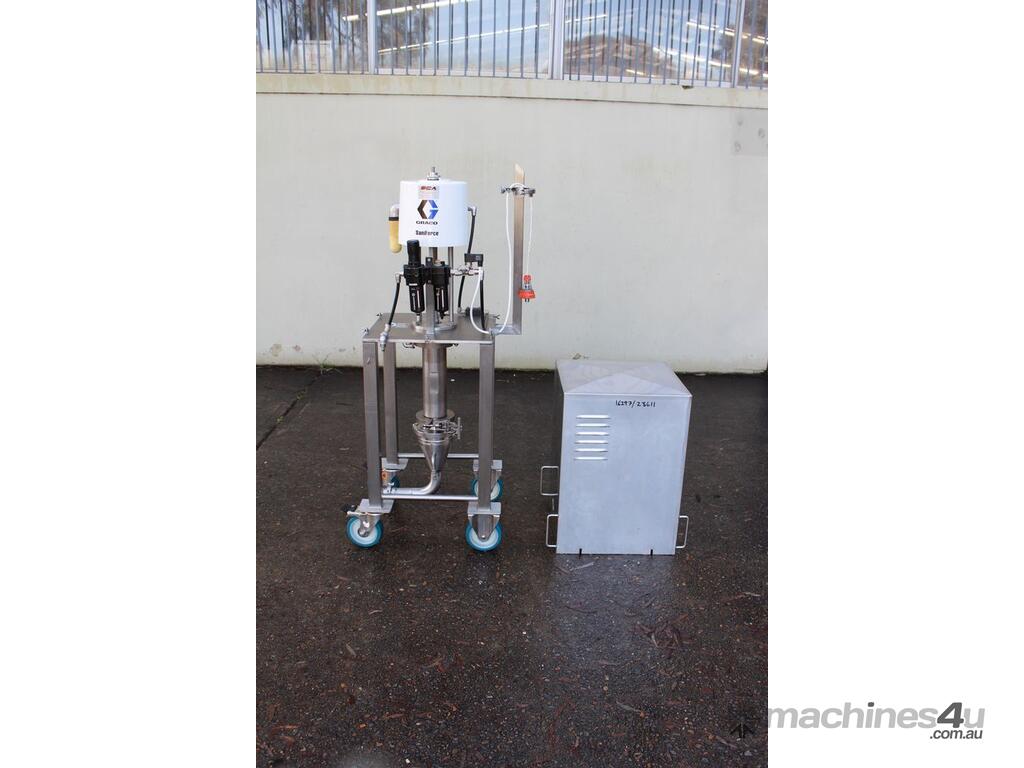 Graco SaniForce 12:1 Transfer Pump: Flow rates up to 8.5 gpm (32 lpm), maximum fluid pressures up to 1200 psi (83 bar, 8.3 MPa), suitable for high viscous material, Suitable to pump products such as: cosmetics, fruit juice concentrates, creamy candy fillings, ice cream variegates, jams and jellies, fitted with electrical air valve, set up on high grade stainless steel trolley with a stainless cover