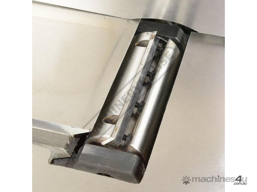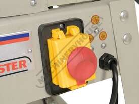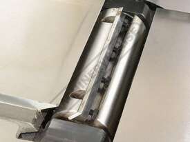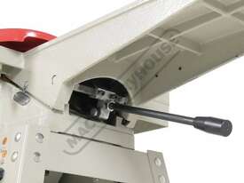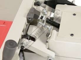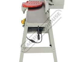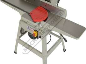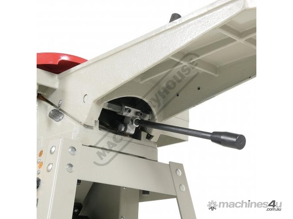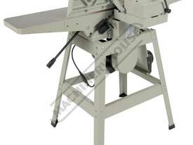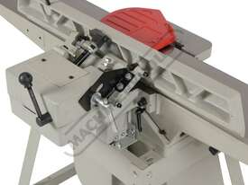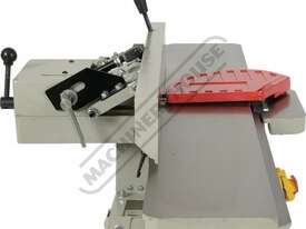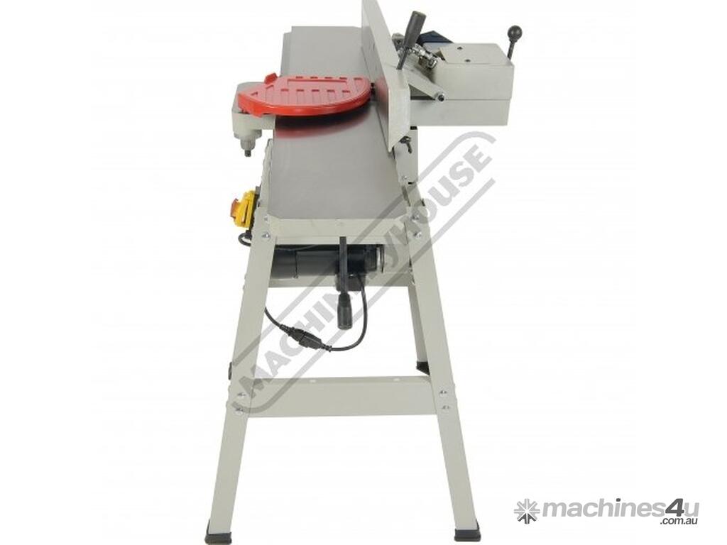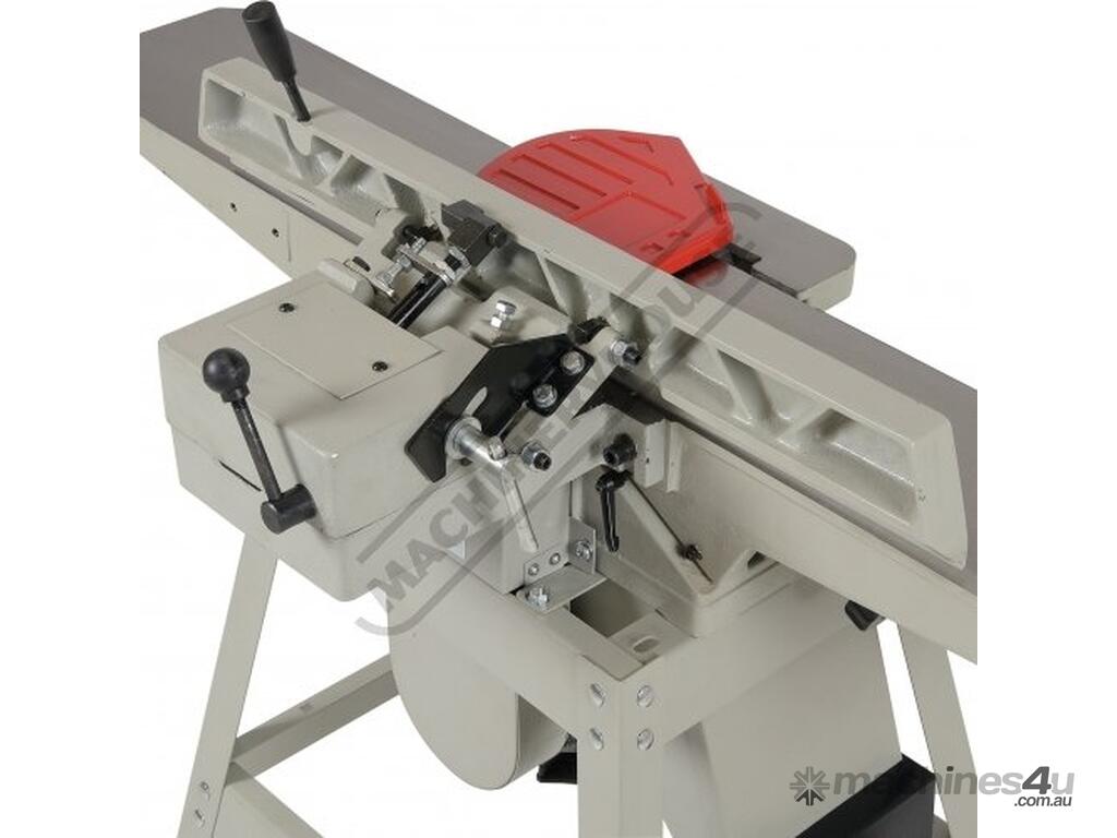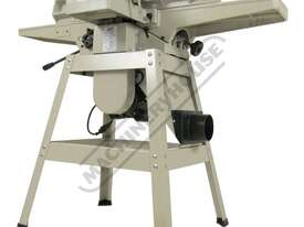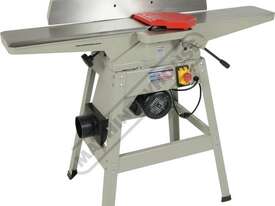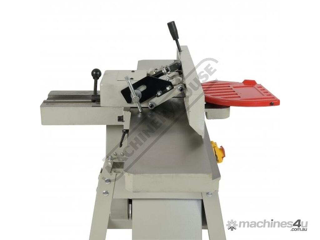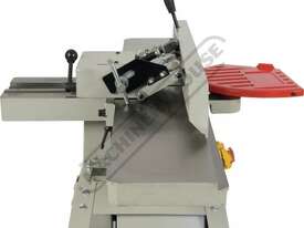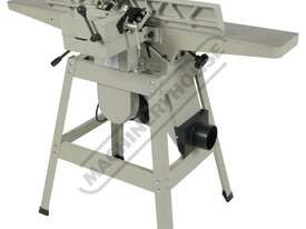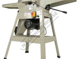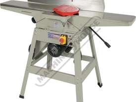 This surface planer is constructed largely of cast iron and is mounted on a fabricated sheet metal frame stand which also houses the motor and the switchgear. The planer cutter blades are fully protected across its whole width by a strong aluminium guard with spring load return for additional safety. The infeed and outfeed tables are 1170mm in total length and are both independently adjustable for height, which not only makes for quick adjustment of the blade height relative to the table but allows for quick set up to produce rebates up to 8mm deep. There is also a quick stop system on the infeed table to allow repeat depth settings to be made quickly.