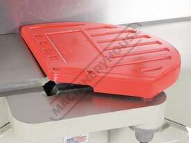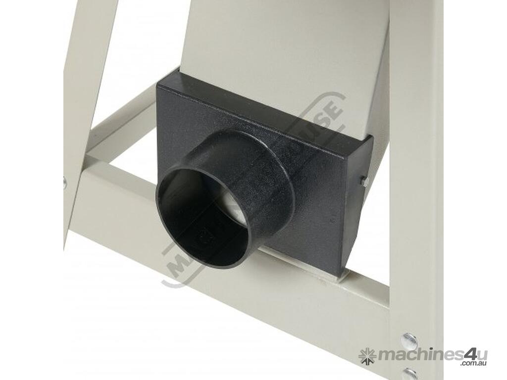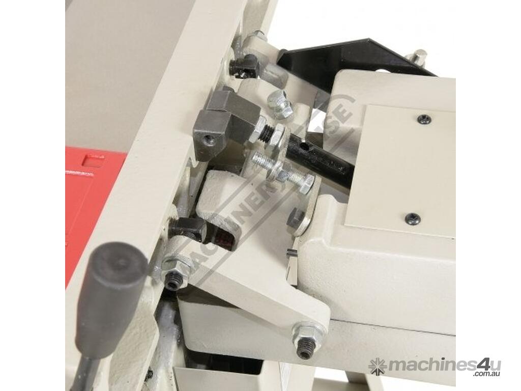 The side fence, which is a heavy cast iron unit with a ground surface, is held by a robust cast iron bracket. This is clamped to the table by a substantial hand lever and slides smoothly across the bed guided by a rail. The fence is fully adjustable for angles between 45°, 90° and 135°. Waste extraction is from the side rear of the machine via a 100mm outlet port that is fixed to the stand and should be connected to a suitable dust extractor.