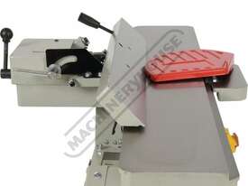 This surface planer is constructed largely of cast iron and is mounted on a fabricated sheet metal frame stand which also houses the motor and the switchgear. The planer cutter blades are fully protected across its whole width by a strong aluminium guard with spring load return for additional safety. The infeed and outfeed tables are 1170mm in total length and are both independently adjustable for height, which not only makes for quick adjustment of the blade height relative to the table but allows for quick set up to produce rebates up to 8mm deep. There is also a quick stop system on the infeed table to allow repeat depth settings to be made quickly.